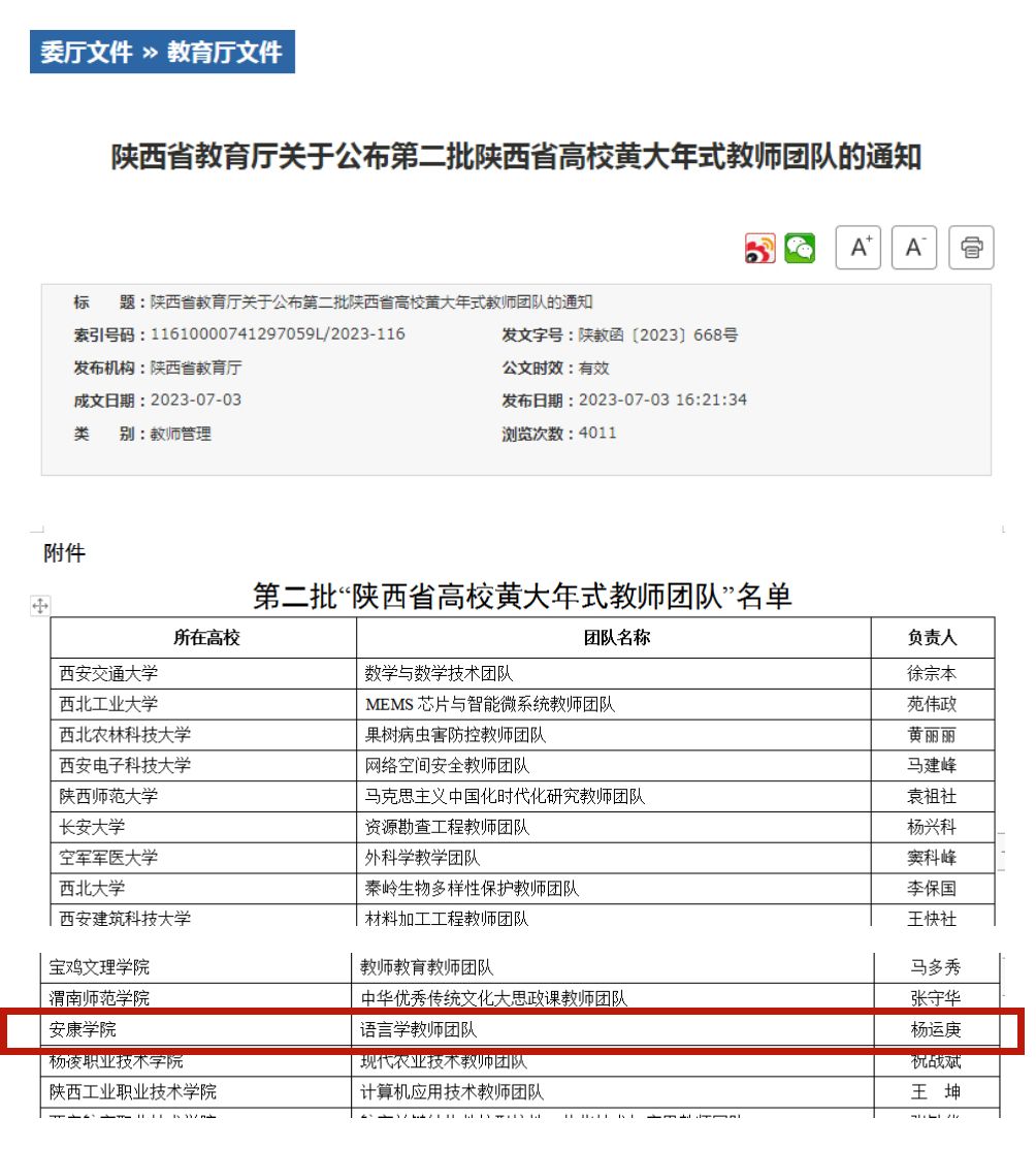 7月3日,根据陕西省教育厅印发的《陕西省教育厅关于公布第二批陕西省高校黄大年式教师团队的通知》(陕教函〔2023〕668号),我院杨运庚教授牵头申报的“安康学院语言学教师团队”荣获第二批陕西省高校黄大年式教师团队创建项目。