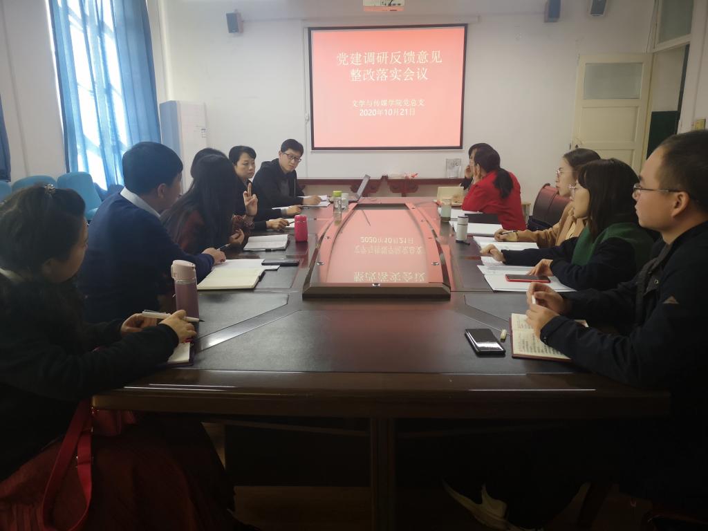 10月21日下午,文传学院在2307召开党建调研反馈意见整改落实会议,学院党总支委员、教工一、二党支部委员和学生一、二党支部书记参加会议,会议由党总支书记芦伟主持。