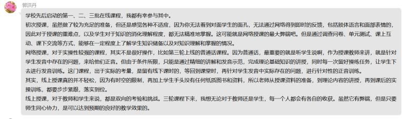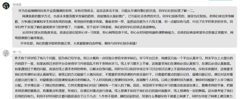 随后,老师们结合近期线上教学的开展情况,分享了对于线上教学的经验和个人建议;学生们围绕习近平总书记在回信中对大学生的期望和要求,结合网课学习的经历,交流分享了提高网课学习效率的经验和方法。老师们普遍认为线上教学有很多优势,在具体操作时需要老师进行精心的设计和准备,要注意对学生的引导和对线上课堂的管理,同时,也要及时听取学生的建议,对课堂环节的设置等进行适时调整。同学们也表示线上学习的两个月里有不少收获,积累了很多线上学习的经验,同时就学习中的具体问题和老师们进行了深入探讨。