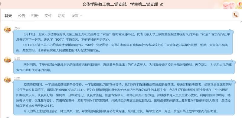 活动伊始,沈菲带领大家共同回顾了抗击新冠肺炎疫情期间习近平总书记写给在首钢医院实习的西藏大学医学院学生的回信和给北京大学援鄂医疗队“90后”党员的回信,老师们和学生们都纷纷表示要以习近平总书记回信中的精神鼓舞自己,在属于自己的战线上,冲锋在前,练就本领,坚决打赢这场防疫阻击战。
