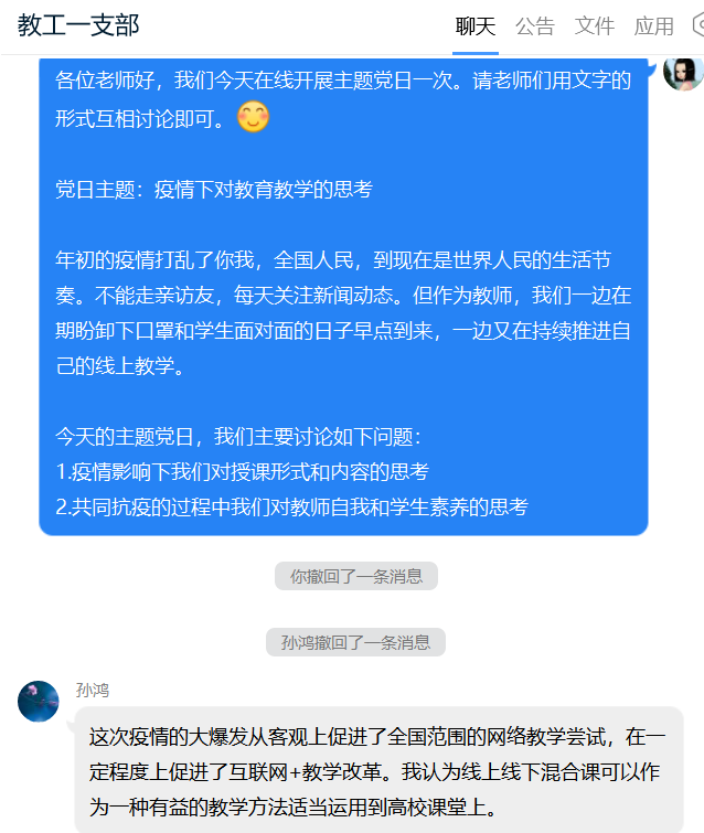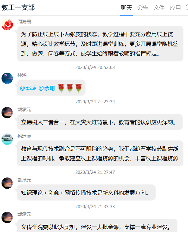2020年3月24日晚,文传学院教工一支部通过QQ群网络平台开展以“疫情下的教育教学思考”为主题的线上主题党日活动。本次活动由教工一支部书记李婷主持,全体党员围绕“疫情影响下对授课形式和内容的思考”“共同抗疫过程中对教师自我修养和学生素养的思考”等方面展开热烈讨论。
