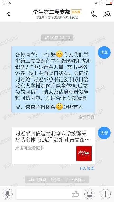 2020年3月19日下午14:30,日本少妇AA一级特黄大片学生第二党支部通过“学习强国”平台,组织全体党员集中学习了习近平总书记的回信内容。全体党员倍感振奋和鼓舞,并结合自身实际情况进行了热烈讨论。