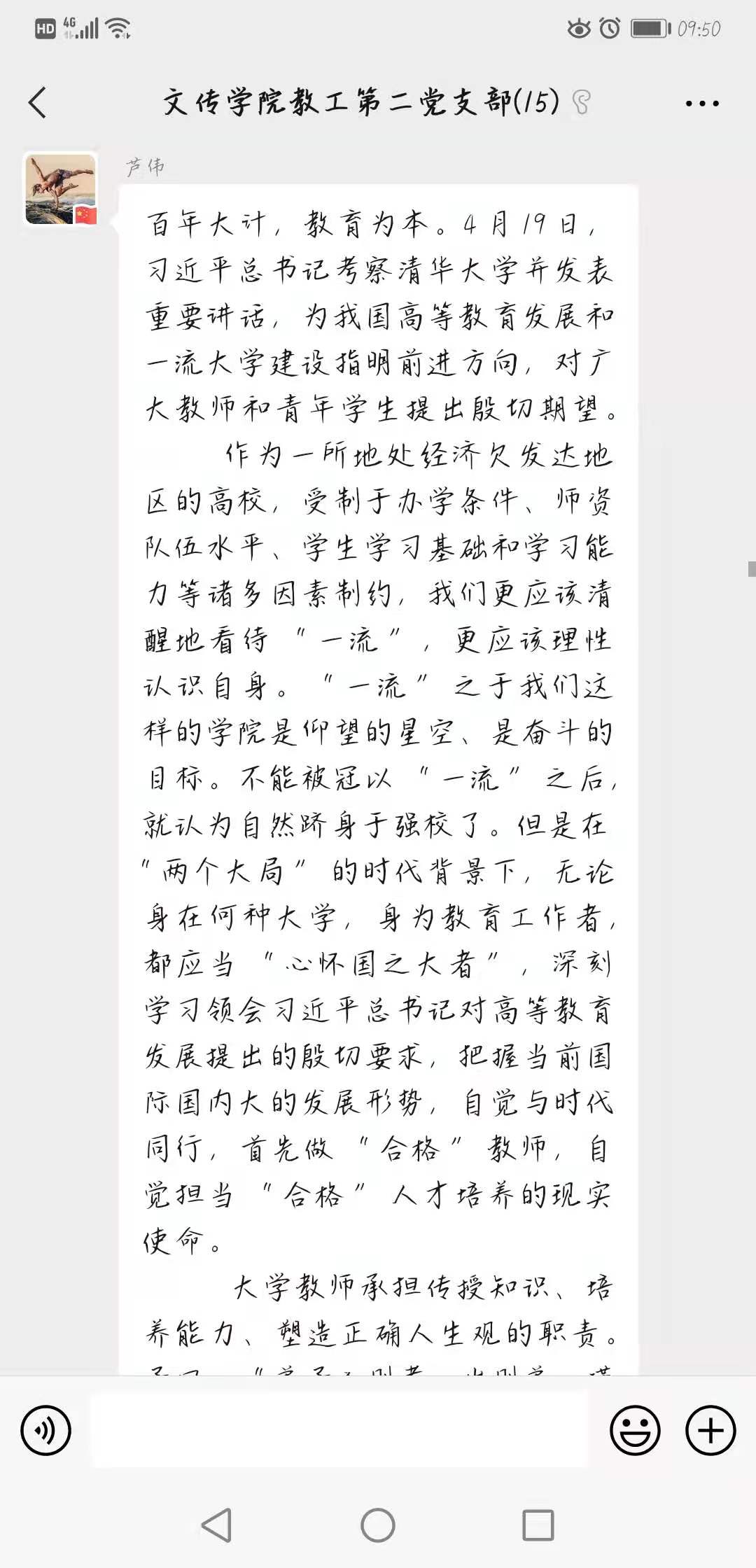 4月29日,文传学院教工二支部依托支部微信平台开展了“深入学习习近平总书记清华考察重要讲话,牢固树立高校‘立德树人’根本任务”主题党日活动。活动由教工二支部书记谭诗民主持,支部全体党员共同学习并参与讨论。