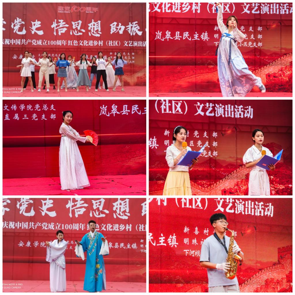为扎实推进党史学习教育走深走实,6月1日下午,文传学院党总支与直属三党支部把党史学习教育与助力乡村振兴相结合,进一步发挥社团活动优势,传承革命精神,带领支部10余名党员和学生文艺演出团队前往学校帮扶的岚皋县民主镇新喜村,开展了庆祝建党百年“学党史 悟思想 助振兴”红色文化进乡村文艺演出活动。