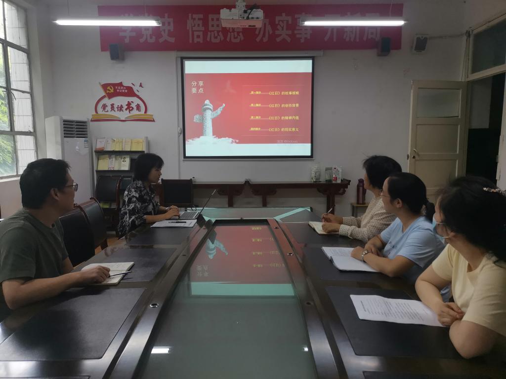 2021年9月22日下午四点半,文传学院教工一支部党员在2307会议室继续开展“现当代文学中的党史”党员读书专题活动,本次活动由我院副院长李婷同志为大家分享《红日》中的党史。