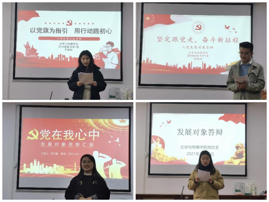 2021年12月2日16:00,文传学院学生党支部在2307会议室组织开展了文传学院2021年下半年发展对象述职答辩会,党总支副书记杨海蓉、学生第一党支部书记彭潇、学生第二党支部书记薛涛、辅导员邹棠华、学生支部委员及25名发展对象加本次答辩会。会议由薛涛主持。