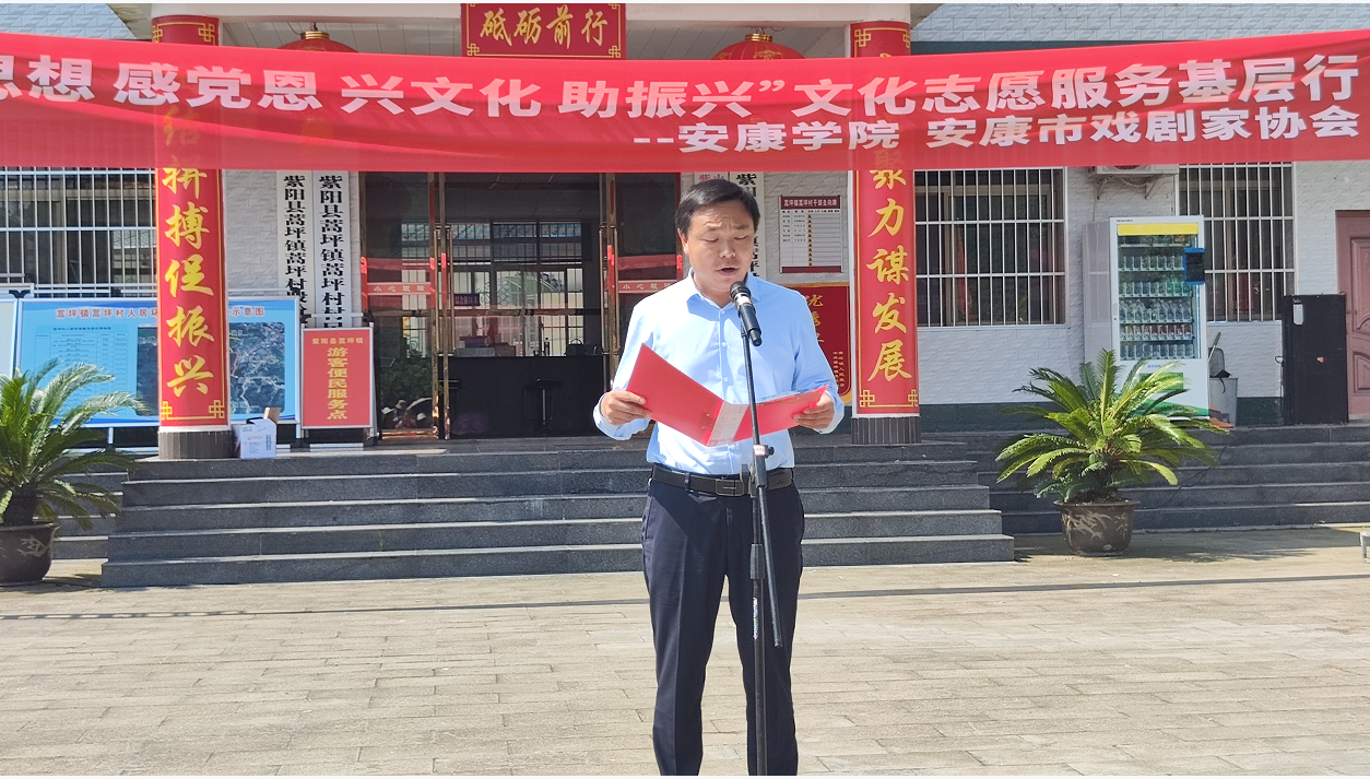 活动伊始,紫阳县蒿坪镇镇长袁超代表镇政府对我院文化志愿服务行活动表示热烈欢迎,介绍了蒿坪镇基本情况、文化建设、支柱产业和乡村振兴特色发展思路。院长杨运庚代表文传学院对蒿坪镇政府的大力支持表示了感谢,介绍了文传学院教学科研以及在地方文化研究方面取得的成绩,重点说明了本次活动的主要目的、内容和形式。安康市戏剧协会作为本次活动的联合承办单位,向学院、镇政府表示了感谢。