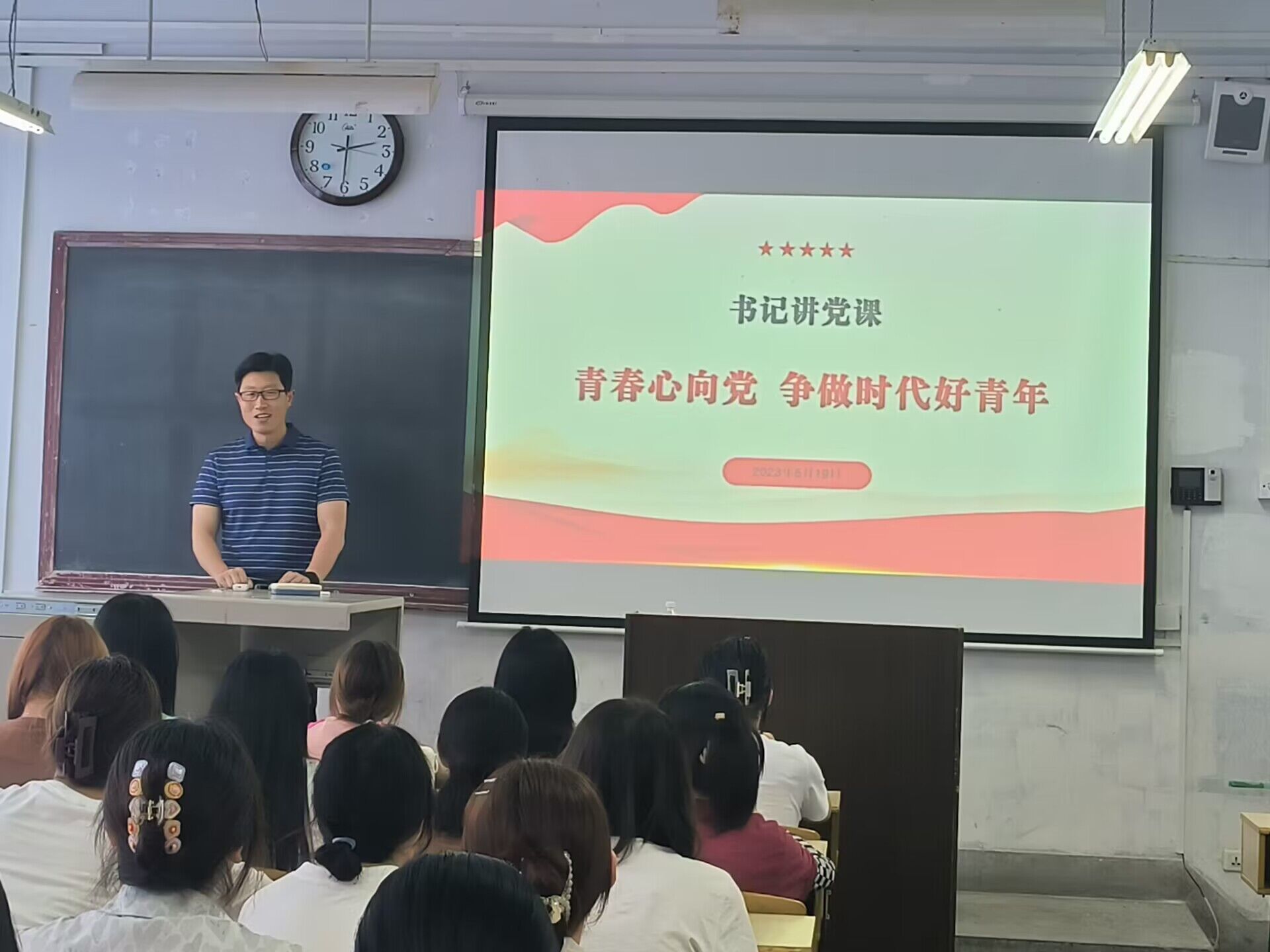 为了推进学习贯彻党的二十大精神和习近平新时代中国特色社会主义思想向下延伸,提高青年学生的思想认识和爱国爱党爱社会主义情怀、增强历史使命担当和责任感,引领青年大学生与新时代同呼吸共命运,2023年5月19日下午,学院党总支书记芦伟深入2022级汉语言文学4班,以“青春心向党,争做时代好青年”为题为学生们讲党课。