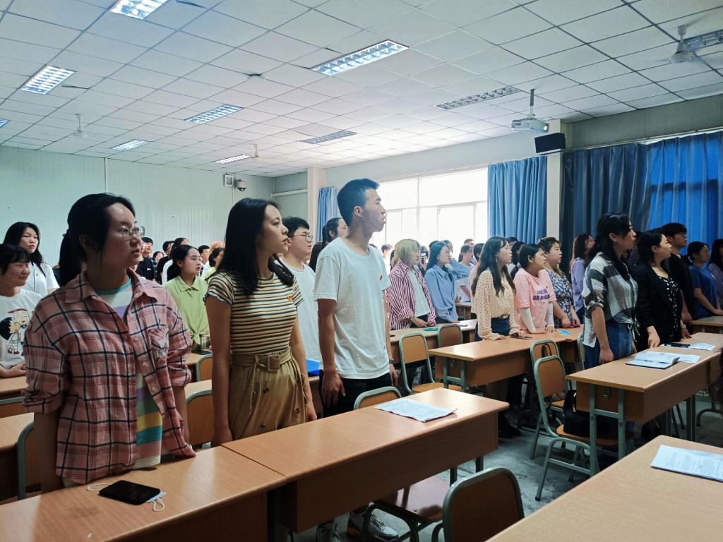 在庄严的国歌声中,大会拉开帷幕。路怡鸿宣读了新团员名单,杨海蓉、彭潇两位老师向新团员颁发团章、团员证、团徽,新团员在团总支副书记薛镯的带领下面对团旗进行了集体宣誓。薛镯对新团员表示热烈的祝贺,同时勉励新团员积极进取,勇攀高峰,争做政治上的接力者、学习中的佼佼者。