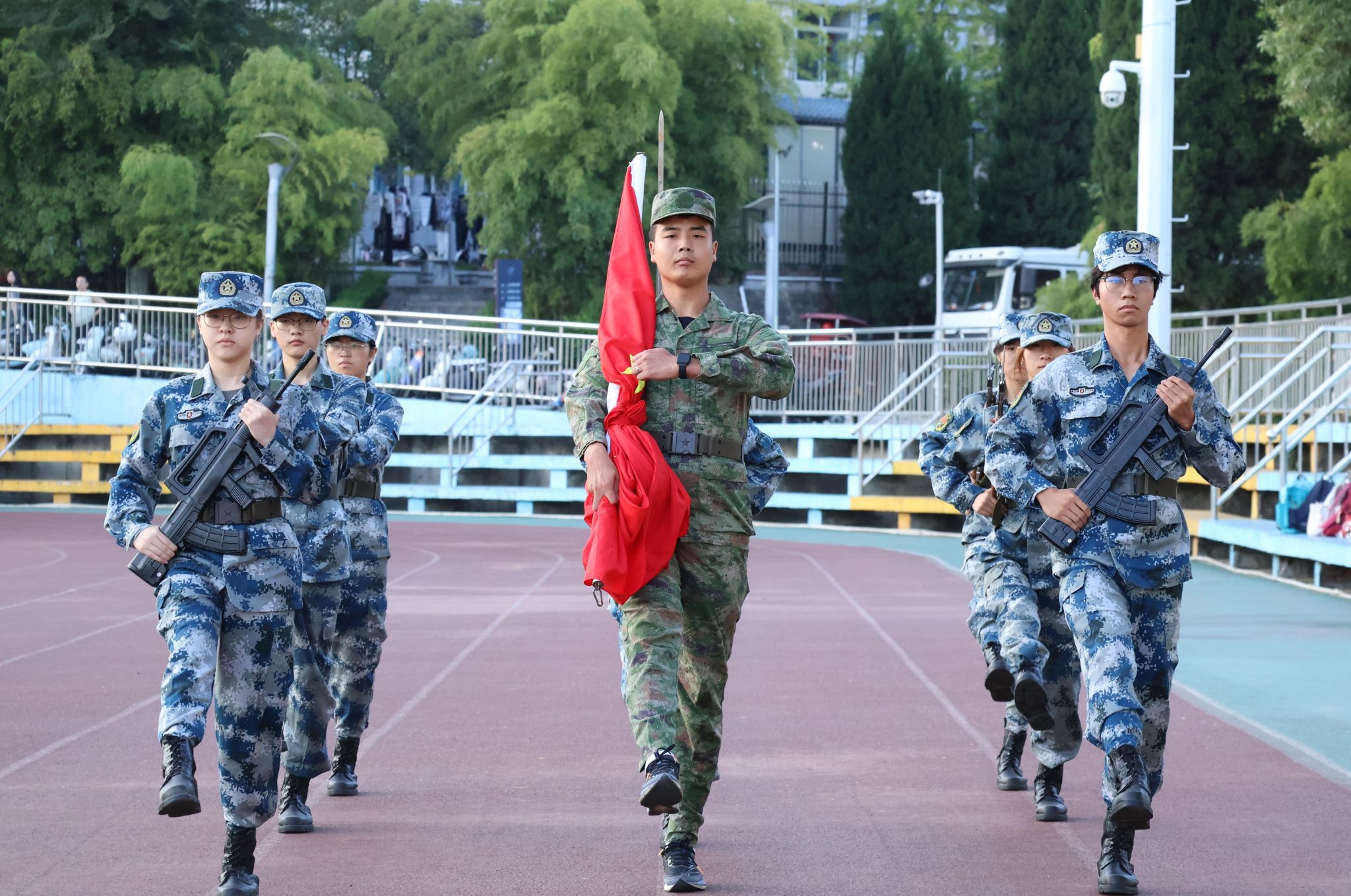 活动伊始,国旗护卫队升旗。在庄严肃穆的氛围下,国旗护卫队队员们迈着铿锵有力的步伐,护送五星红旗走向升旗台。全体师生为九一八遇难同胞默哀三分钟,静默中充斥着对历史的悲痛与对先烈的敬仰。