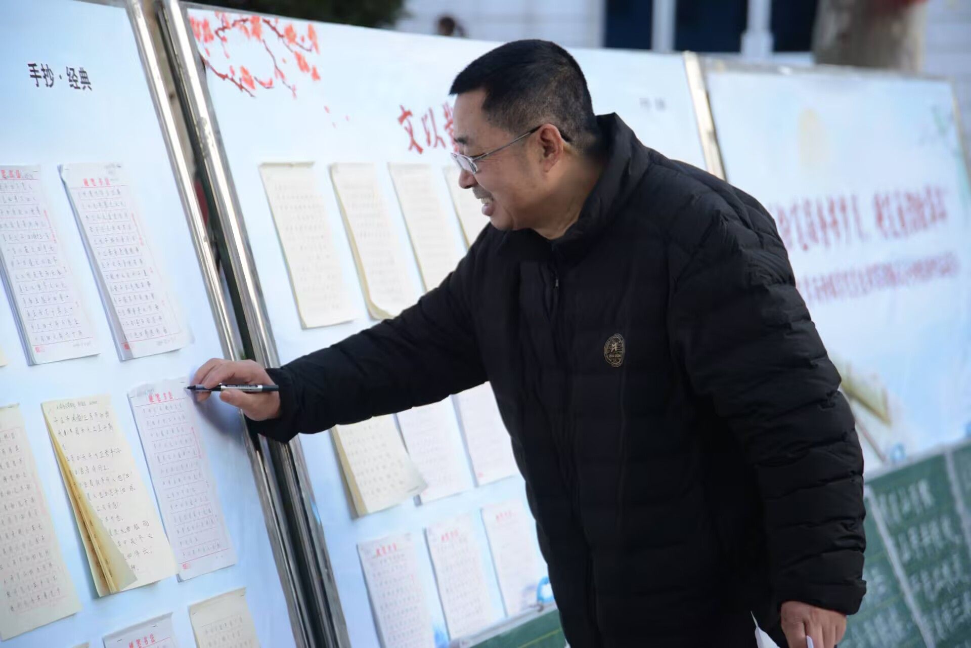 校园林荫道旁,粉笔字展示区的七言诗抄写精彩纷呈,有的字体刚劲有力,如颜筋柳骨般气势恢宏,将七言诗的磅礴意境表现得淋漓尽致;有的则灵动飘逸,仿佛每一个笔画都随着诗句的韵律在黑板上翩翩起舞。无论是李白的豪放洒脱,还是杜甫的沉郁顿挫,都在学生们的粉笔字中得以生动呈现,引得过往师生纷纷驻足欣赏。