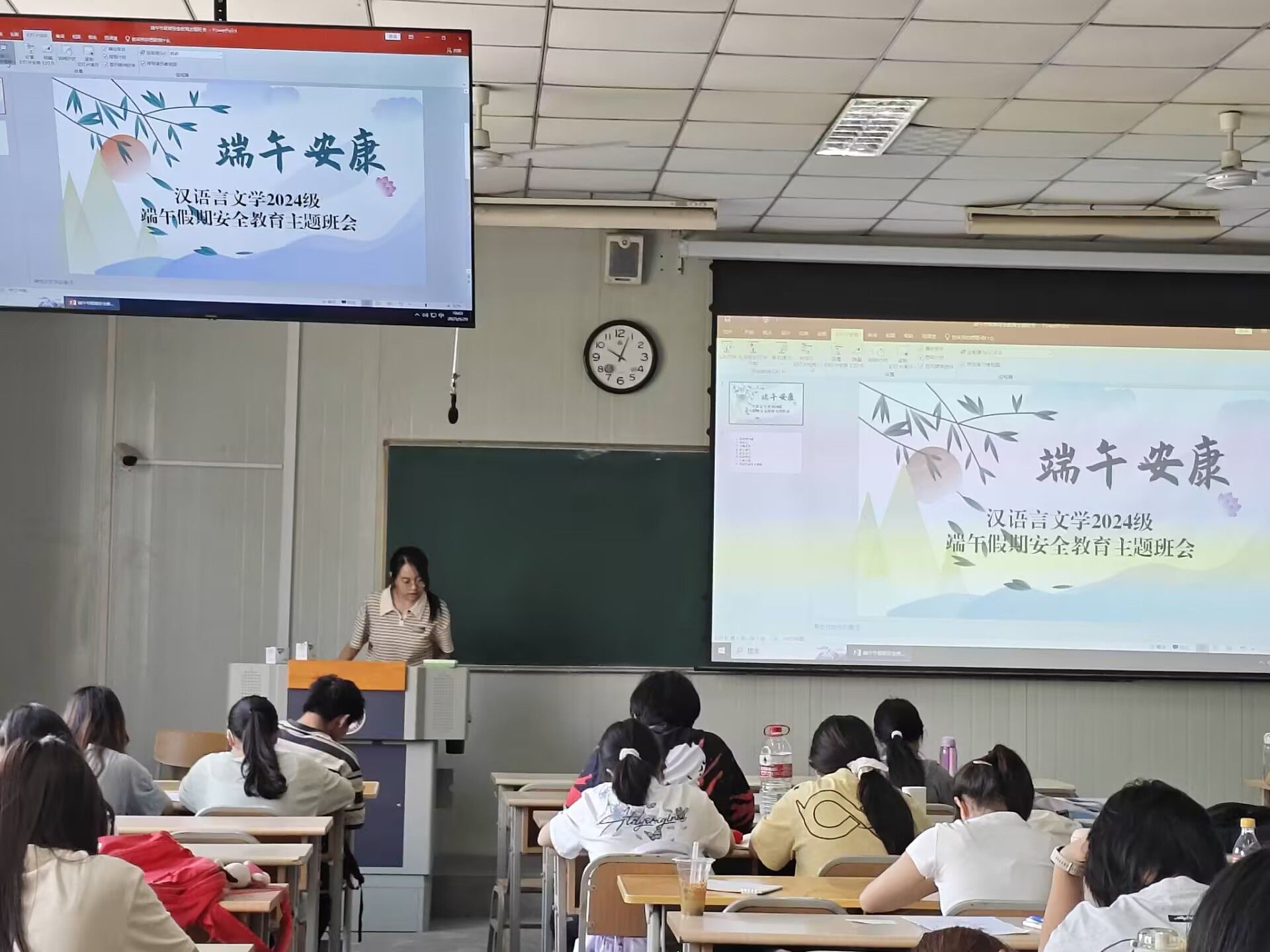 班会上,老师们通过图片和视频,向同学们介绍端午节的起源、传说以及各地丰富多彩的节日风俗,同学们在深厚的传统文化氛围中,进一步增强文化认同感和民族自豪感。在安全教育环节,老师们围绕人身安全、财产安全、交通安全、网络安全等多个方面,结合实际案例讲解假期需要注意的安全事项。针对外出游玩的同学,重点强调遵守交通规则、避免前往危险区域;对于留校学生,提醒注意宿舍用电安全;提醒同学们要提高网络安全意识,警惕电信诈骗,避免陷入各类网络陷阱;遵守学校规定,保持通讯畅通,及时向老师和家长报备行程。