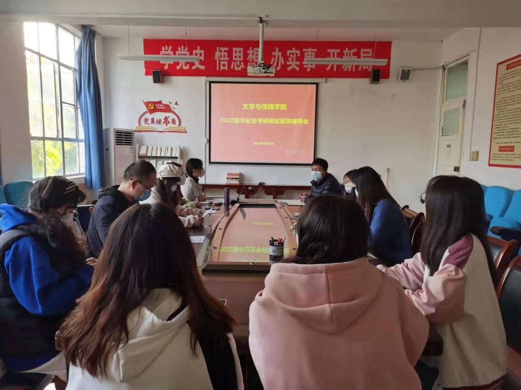 为帮助考研学生更清晰地了解研究生考研复试与调剂相关政策,让同学们有重点的准备复试,提高复试成功率。文传学院于2022年3月23日在2307室组织开展了2022届毕业生考研面试辅导会。文传学院党总支书记芦伟,综合办公室主任崔瑜,网媒与秘书专业系主任谭诗民,学工办副主任薛涛,青年教师张格瑄、盘珊君、罗相如以及2022届考研上线学生参加了会议。会议由薛涛主持。