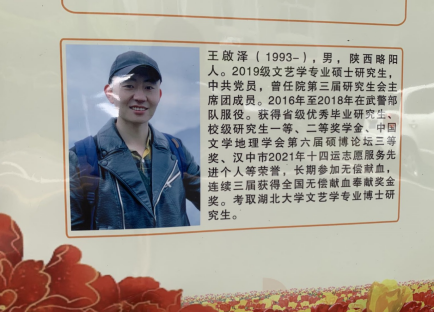 除了坚持自己专业方向的研究,王啟泽还注重提高自己的综合素质。研二时,他被任命为学院研究生会主席,协助老师举办了由陕西理工大学文学院(今人文学院)承办的第四届全国汉代文学研讨会、纪念黎锦熙先生诞辰130周年暨现代汉语语法研讨会、陕西·汉中2020语文教育论坛等大型学术会议,组织学院研究生“旱麓”学术论坛、“博望论坛”读书沙龙等活动,创办并成功举办了“天行健”系列文体活动,同时加入党员先锋队,为学校疫情防控、研究生招生考试考点考务工作、大型校级活动组织等贡献自己的力量。2021年9月,王啟泽作为志愿者在十四运汉中赛区天汉楼城市志愿者服务队参加志愿服务,获评汉中市2021年十四运志愿服务先进个人;同月,王啟泽累计参加无偿献血达100次,连续三届获得全国无偿献血奉献奖金奖,事迹被《汉中日报》报道。2021年12月,王啟泽被评选为陕西理工大学陕西省2022届优秀毕业研究生候选人(已在2022年6月公示)。可以说,王啟泽同学不仅受到身边师生的喜爱,在学院、学校范围起了引领作用,而且在省市学子,乃至全国文学地理学领域硕士研究生中,都传播着正能量,发挥了积极的意义。