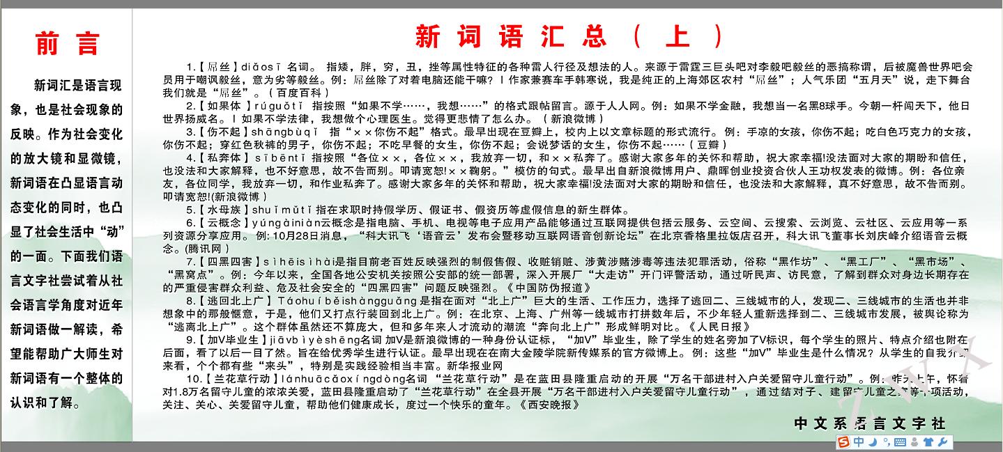 导航痕迹 首页 > 学生工作 > 专业社团 > 正文 教育管理 资助工作 就业工作 学子风采 专业社团 语言文字社简介 发布人:zwx 发布日期:2015年06月18日 阅读次数: 中文系语言文字社是针对本系学生要求达到“能说会写”的教学目标应运而生的社团组织,是课外实践活动的一项重要内容,也是提高学生语言文字运用能力、规范化使用语言文字的重要辅助手段。它对于繁荣本系社团文化,激发学生的学习热情,加强中文系学生的综合素养的培养,都具有重要意义。语言文字社的宗旨是:实践性,操作性,应用性。社团自成立以来,以语言实践为目的,开展了各种形式、丰富多彩的语言文字活动,不断探索新的语言文字的教学实践方法,力求将语言文字的专业知识具体运用到写作实践和生活实践。