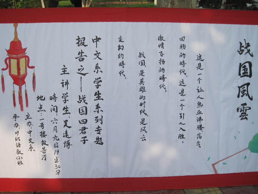 2010年6月9日晚,在中文系的组织下,09级语文教育2班学生吴远博以他幽默的语言给同学们在一号教学楼六楼报告厅做了一场题为“战国四公子”的读书报告。在报告中吴远博同学首先从战国一词的由来概括了战国时期历史发展的脉络,接着重点从战国四公子――孟尝君、平原君、春申君和信陵君入手,以四位公子的典型故事为例谈了自己对战国历史文化的独特见解。其精彩的讲解和生动的语言博得同学们的阵阵掌声。