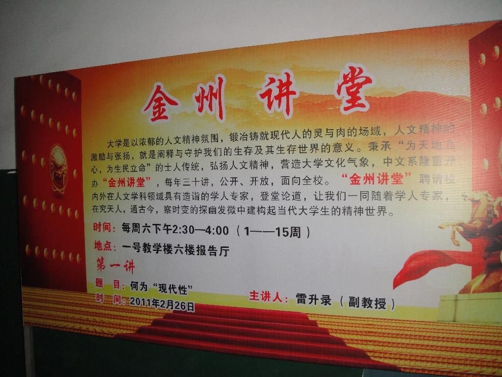 为了进一步营造良好的育人环境,增强校园的学术氛围,更好的落实环境育人的教育理念,我系从本学期开始面向全校师生开办“金州讲堂”系列讲座。2011年2月26日下午14:30,“金州讲堂”第一讲隆重开讲,中文系副主任雷升录应邀在一号教学楼六楼报告厅为300余名师生做了“何为现代性”的专题学术报告。