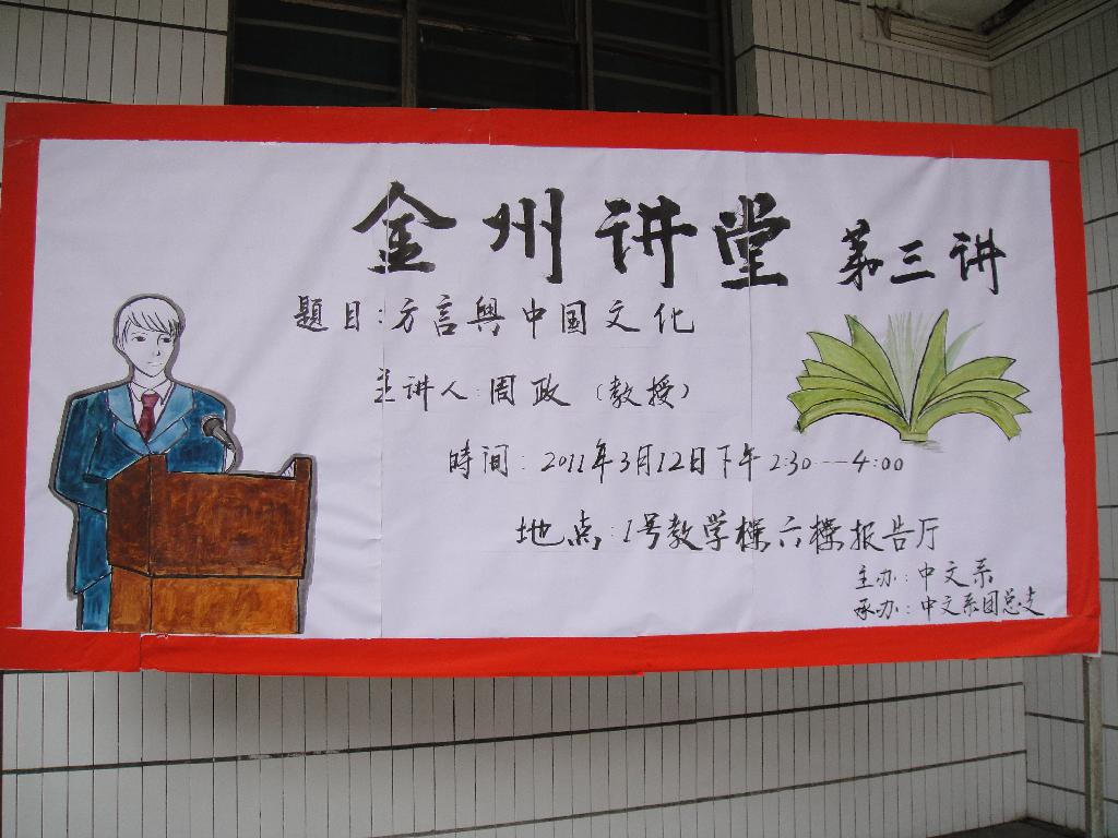 2011年3月12日下午2:30,中文系周政教授为“金州讲堂”在一号教学楼六楼报告厅做了“方言与中国文化”的专题学术报告。