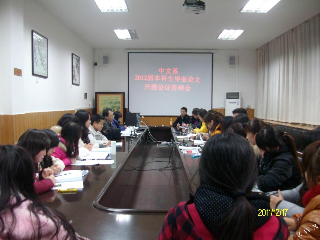 2012届本科生毕业论文写作是本学期的一项重要工作,为保证毕业论文写作质量,按照工作进程安排,2011年12月12日至17日,中文系以教研室为单位,对2012届本科生毕业论文开题报告进行了全面论证,并组织了现场答辩。
