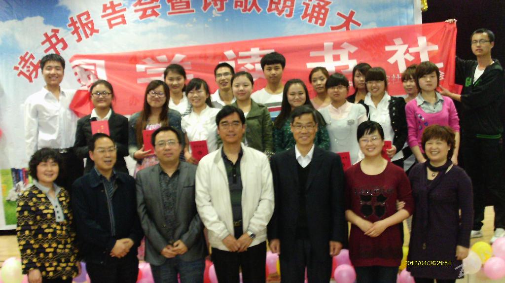 2012年4月26日晚,由中文系国学读书社举办的“读书报告会暨诗歌朗诵比赛”在1号教学楼六楼报告厅举行。中文系党总支书记李岩、中文系副主任梁卫华、教科系副教授李佺宁、中文系副教授赵桃、罗焕玉、杨静及中文系教师朱云、艾全霞莅临本次活动并担任评委。