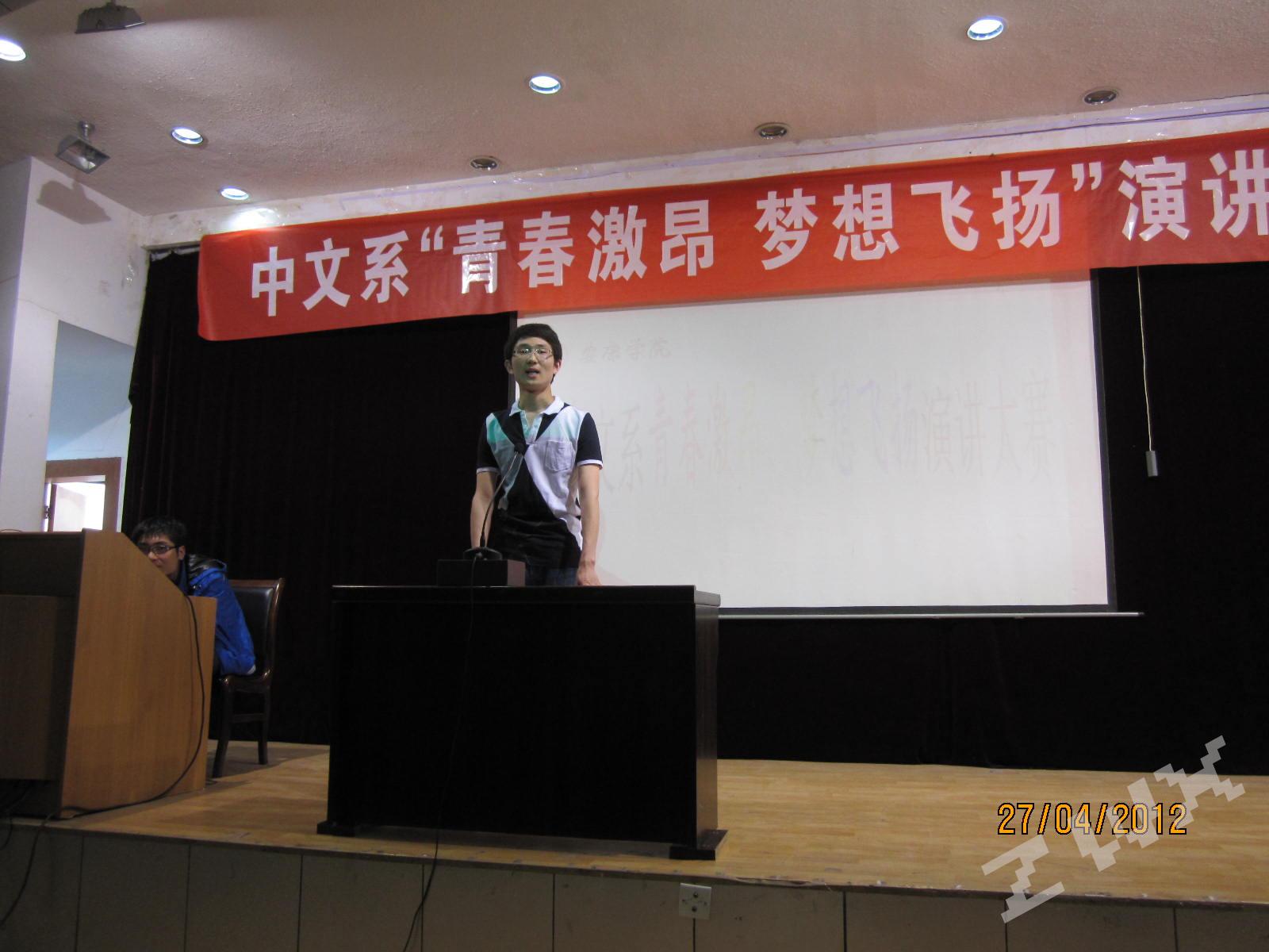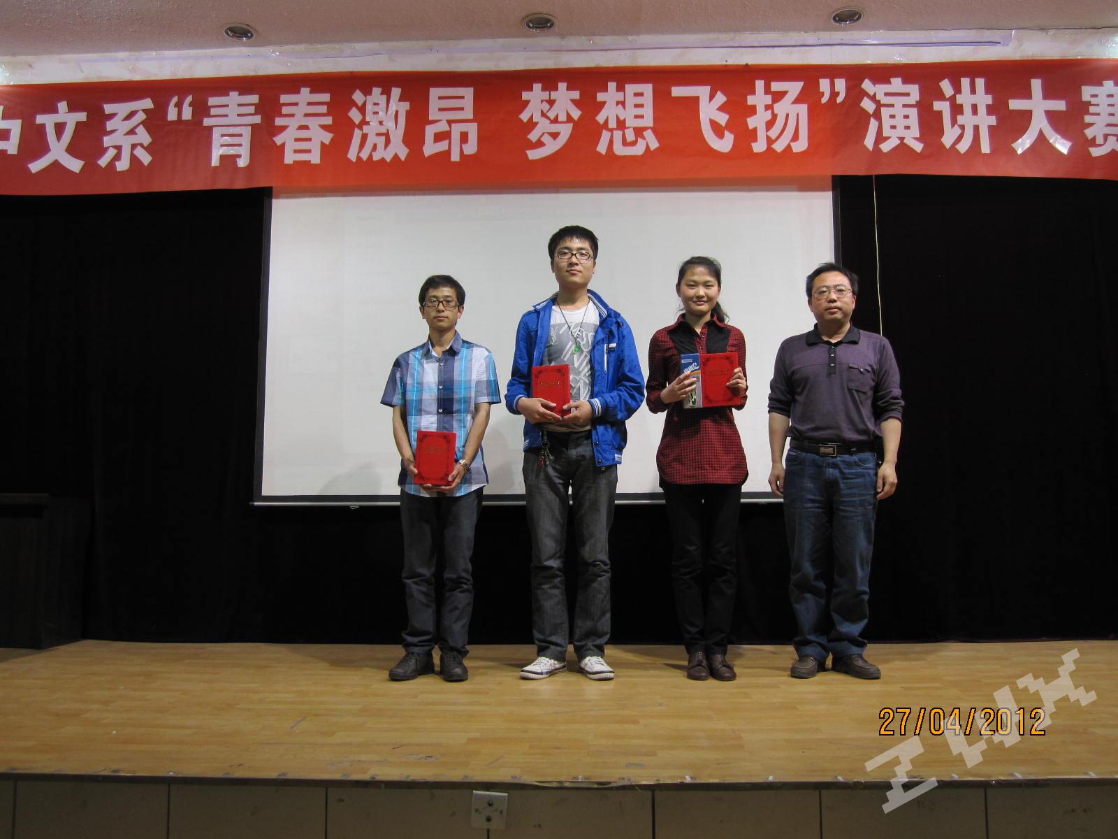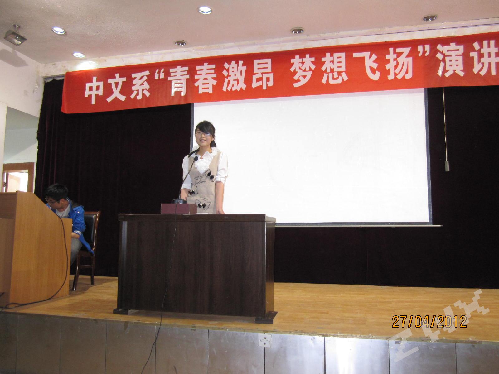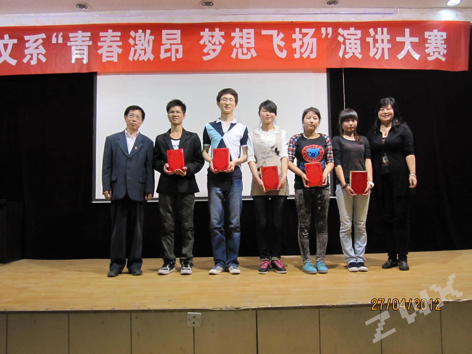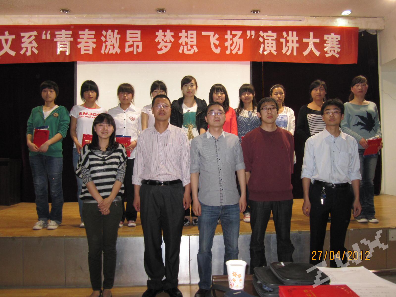 4月27日下午,中文系“青春激昂,梦想飞扬”演讲比赛决赛在1号教学楼六楼报告厅举行,来自2011级汉语言文学和文秘专业的18名选手参与角逐,最终评选出一等奖3名,二等奖5名,三等奖10名。中文系教学副主任梁卫华老师应邀观看了比赛,钮绪纯副教授、邸玲老师等担任了本次比赛评委。