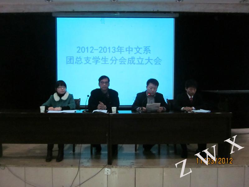 2012年11月23日晚8点,安康学院中文系2012-2013学年度团总支学生分会成立大会在一号楼六楼报告厅正式举行。到会的有中文系党总支书记李岩、团总支书记沈菲;2011-2012学年度团总支学生分会主席团及各部部长、2012-2013学年度团总支学生分会主席团、各部部长及全体干事。成立大会在全体到会人员合唱国歌的旋律中拉开序幕。