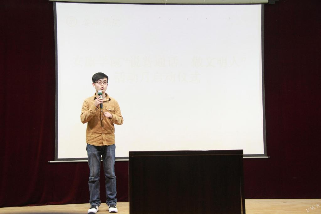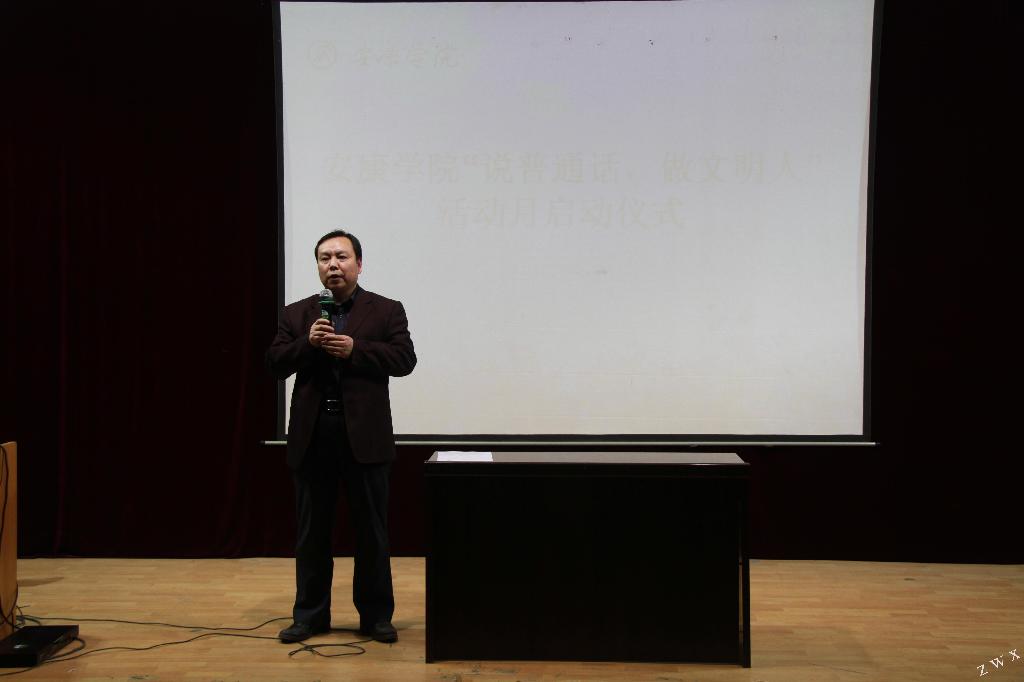 3月21日下午, “讲普通话 做文明人”活动月启动仪式在安康学院1号教学楼6楼学术报告厅隆重举行,中文系党总支书记李岩、教务处副处长常权记、学工部副部长郑武生及学生代表等300余人参加启动仪式,启动仪式由中文系学生牟童和全巧巧主持。
