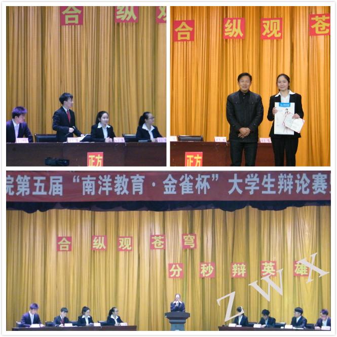 安康学院第五届“南洋教育 金雀杯”大学生辩论赛决赛于2013年12月4日在江南校区大礼堂顺利落幕。决赛双方分别为中文系和艺术系,辩论围绕“大学生村官机遇与挑战哪个更大”展开,我系为正方,辩论立场为“大学生村官机遇大于挑战”。辩手们从大学生村官政策推行的社会历史背景,具体政策内容,大学生村官对个人及国家的重大意义等几个方面周密详实的论证了我方观点。辩手们以缜密清晰的思路,精辟犀利的言辞,给评委、嘉宾及现场观众们留下了深刻印象,以精彩的表现赢得了决赛,获得了本次“金雀杯”冠军。我方辩手、来自语文教育12级1班的全巧巧同学荣获本次辩论赛“最佳辩手”称号。