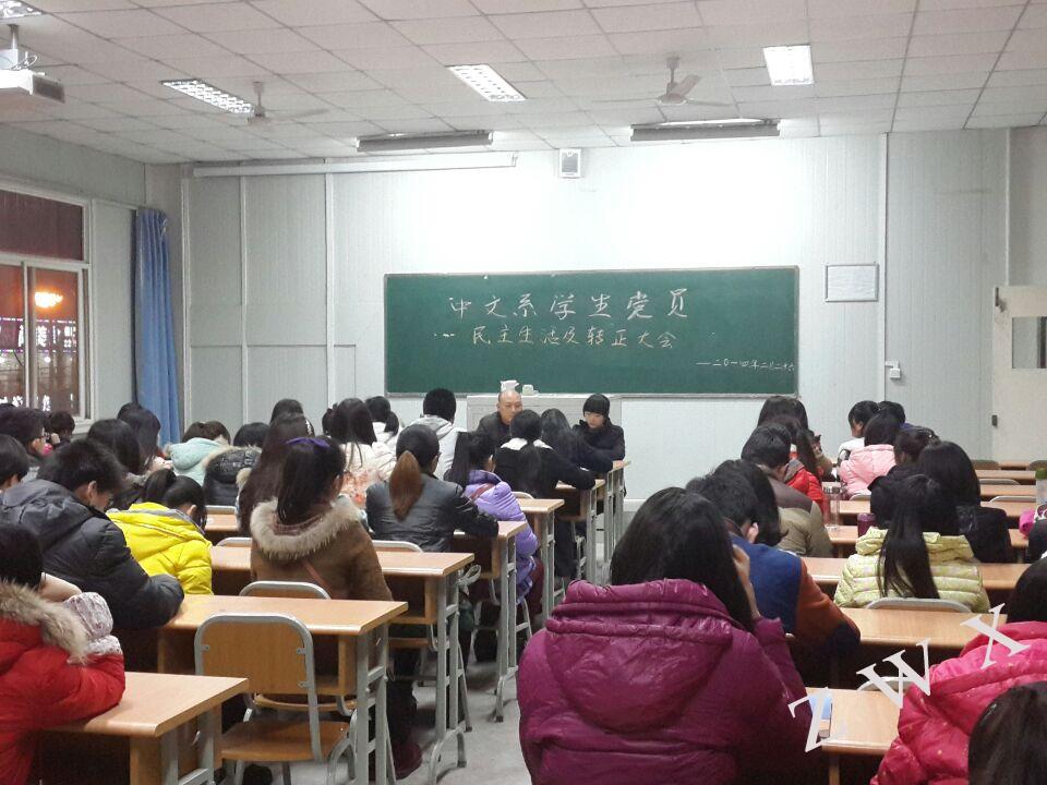 2014年2月26日晚,中文系学生党支部在1022教室召开了中文系学生党员民主生活会及预备党员转正仪式。转正仪式由学生支部书记郝礼军主持,中文系全体学生党员参加了会议。