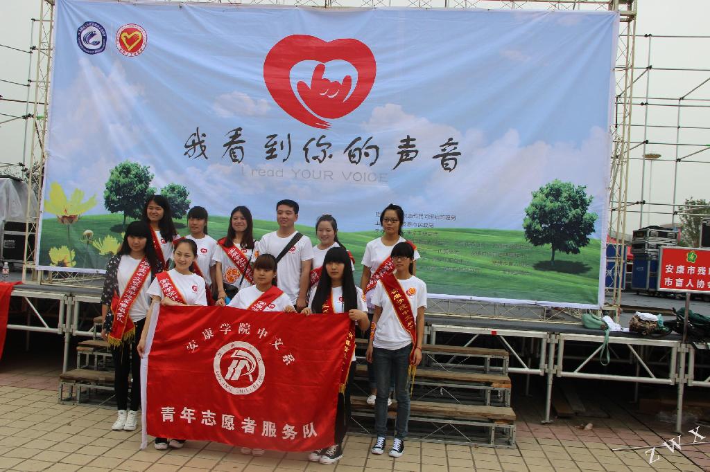 2014年5月26日,我系青年志愿者服务队15名队员应安康市义工联合会的邀请,在安康市金州广场参与2014年世界助残日主题活动“我看见你的声音”大型公益活动。