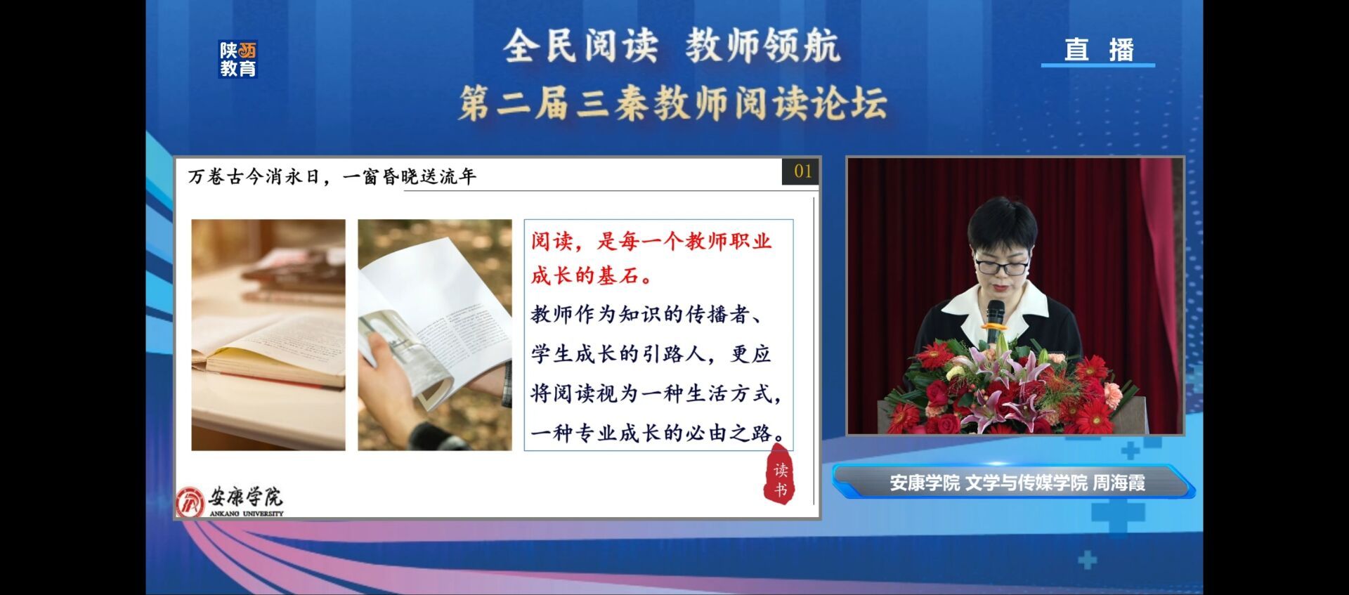 安康学院日本少妇AA一级特黄大片副教授周海霞应邀做了“阅读启迪智慧、点亮人生——教师阅读与成长”专题分享报告,周海霞从阅读与启智润心、阅读与课程教学、阅读与人才培养等方面分析了教师阅读对教育改革创新、教育家精神涵养等方面的重要价值。