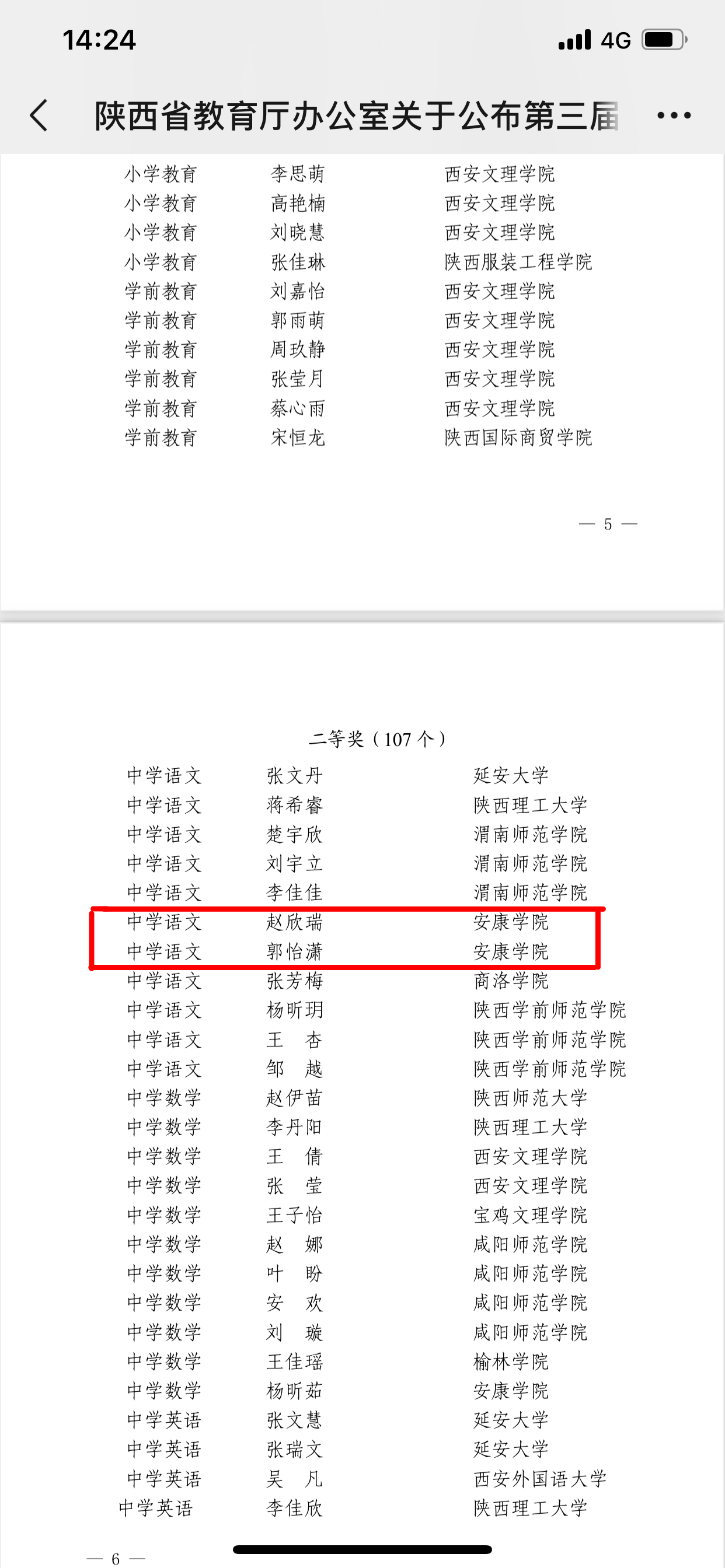 此前,由陕西省教育厅主办、西安文理学院承办、陕西师范大学协办的陕西省第三届高校师范生教育教学能力大赛落下帷幕,我院汉语言文学专业2021级2班赵欣瑞、4班郭怡潇两位同学入围决赛,在张格瑄、唐明珍两位老师的指导下,双双荣获中学语文组二等奖。