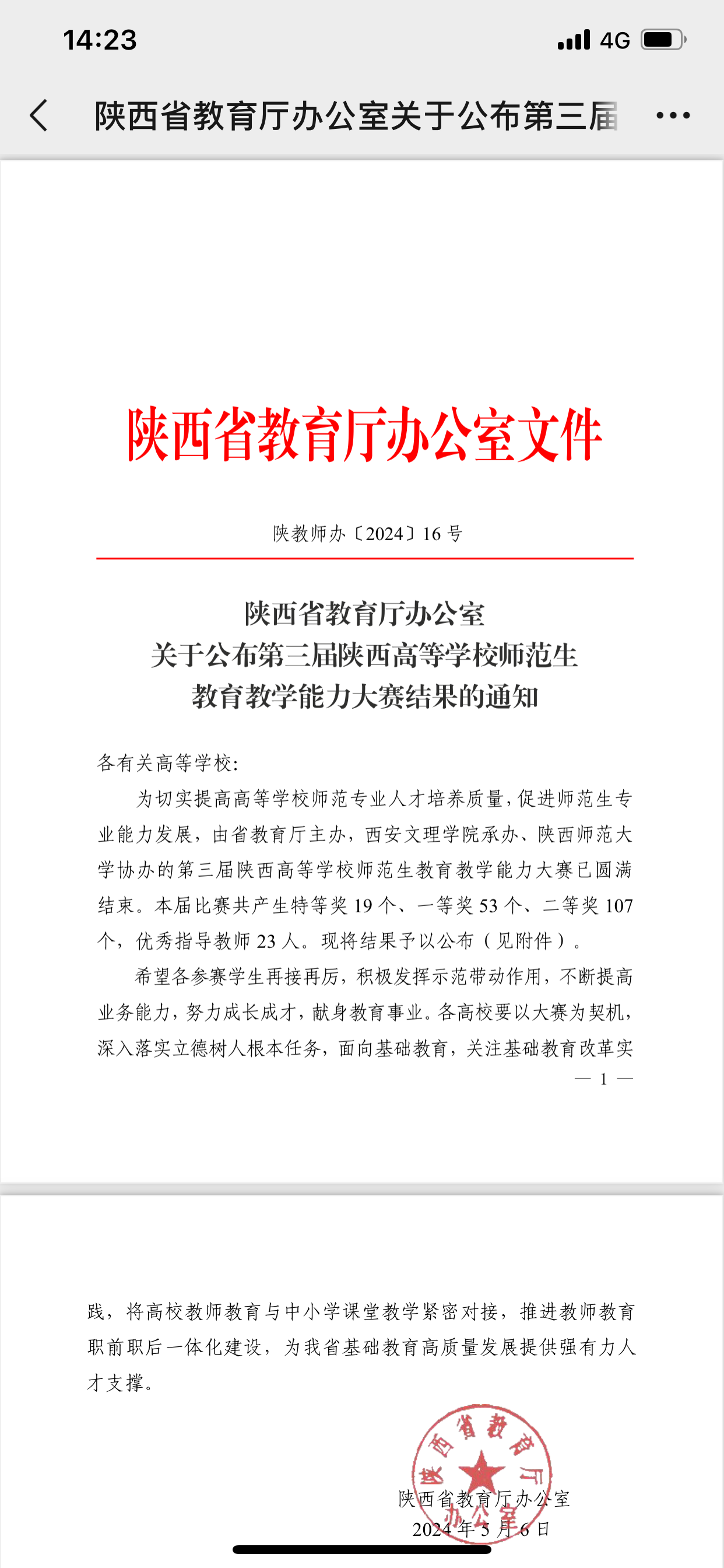 我院历来重视汉语言文学师范专业建设,积极鼓励学生参加各类师范生技能竞赛,以赛促教、以赛促学、学赛结合,推动了师范生教育教学水平的持续提升,学生近段时间在高水平竞赛的连续获奖再次展现了我院汉语文学省级一流专业的办学实绩。