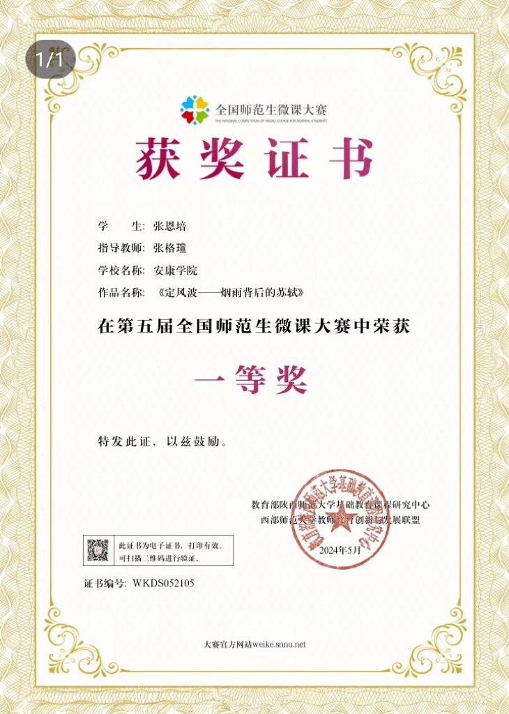 近日,由教育部陕西师范大学基础教育课程研究中心、西北教师教育联盟主办的第五届全国师范生微课大赛获奖名单揭晓,我院汉语言文学专业2021级1班张恩培同学在张格瑄老师的指导下荣获大赛一等奖。