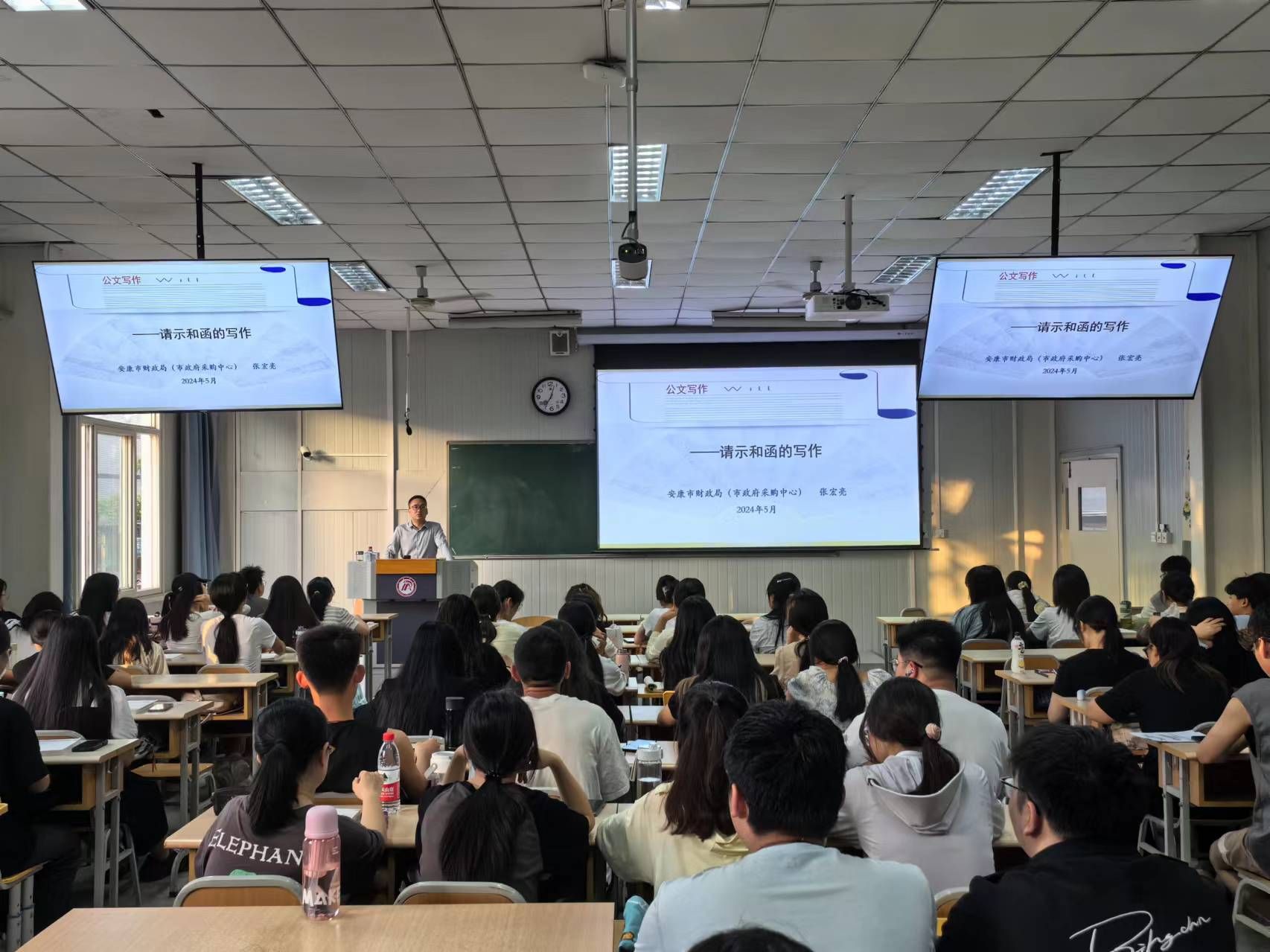 按照应用文写作“双师课程”教学计划,日本少妇AA一级特黄大片分别于5月21日、28日和6月4日、11日、14日邀请课程安康市政府采购中心张宏亮为汉语言文学2023级1、2班学生讲授请示、批复、报告、函、纪要等公文和申论写作的技巧。校内任课教师胡少山随堂参与了授课。