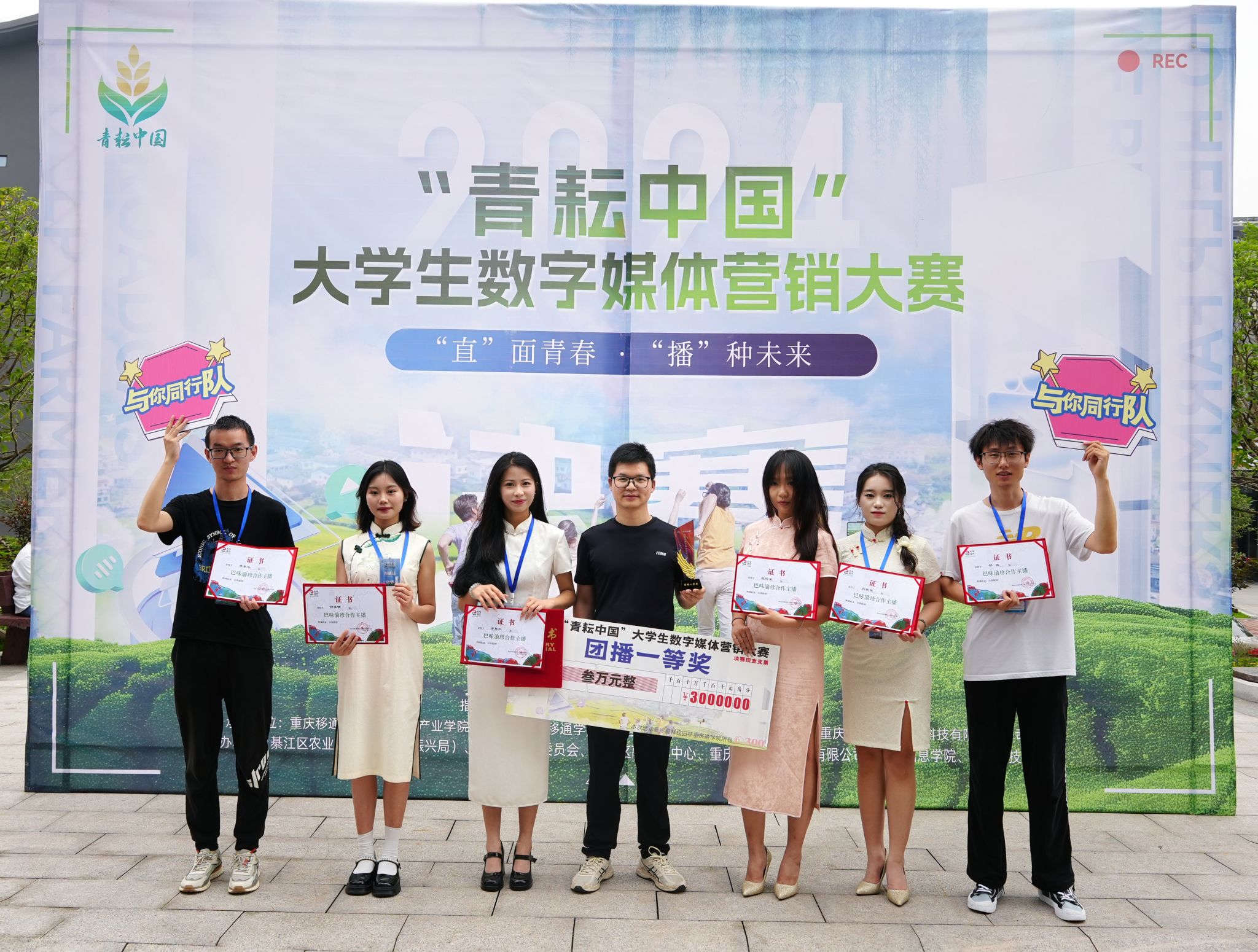 2024年6月18日,备受瞩目的2024“青耘中国”大学生数字媒体营销大赛决赛在重庆移通学院綦江校区举行,来自全国12个省市、50所高校的436支队伍积极响应,2000余人报名参赛。文学与传媒学院精心组织队伍参赛,在秘书与网媒系主任张建涛老师的悉心指导下,由2021级网络与新媒体专业余星红、李家乐、姬裕荣、何希倩、邢磊、刘欣雨六名学子组成的“与你同行”团队凭借出色的表现,闯入总决赛,最终荣获大赛团队一等奖,获得奖金叁万元。