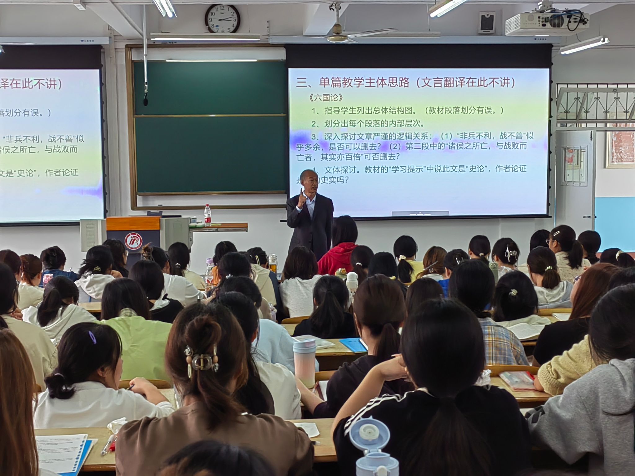程进时老师以“群文阅读”中单篇和群文的关系为主题,以《六国论》和《阿房宫赋》为例展开讲解。程老师通过对两篇文本的深入解读,比较了两篇文本的异同点,并结合自身多年教学实践,向同学们分享了单篇阅读教学和群文阅读教学设计的经验。同时,他还结合统编教材探讨了单篇阅读和群文阅读教学之间的关系,指出了群文阅读教学实施的建议。课堂最后,程老师满怀激情地勉励同学们坚持教育理想,多阅读,多实践,锤炼过硬本领,扎实课堂教学基本功,提高自身综合素养,为职业发展奠定坚实基础。