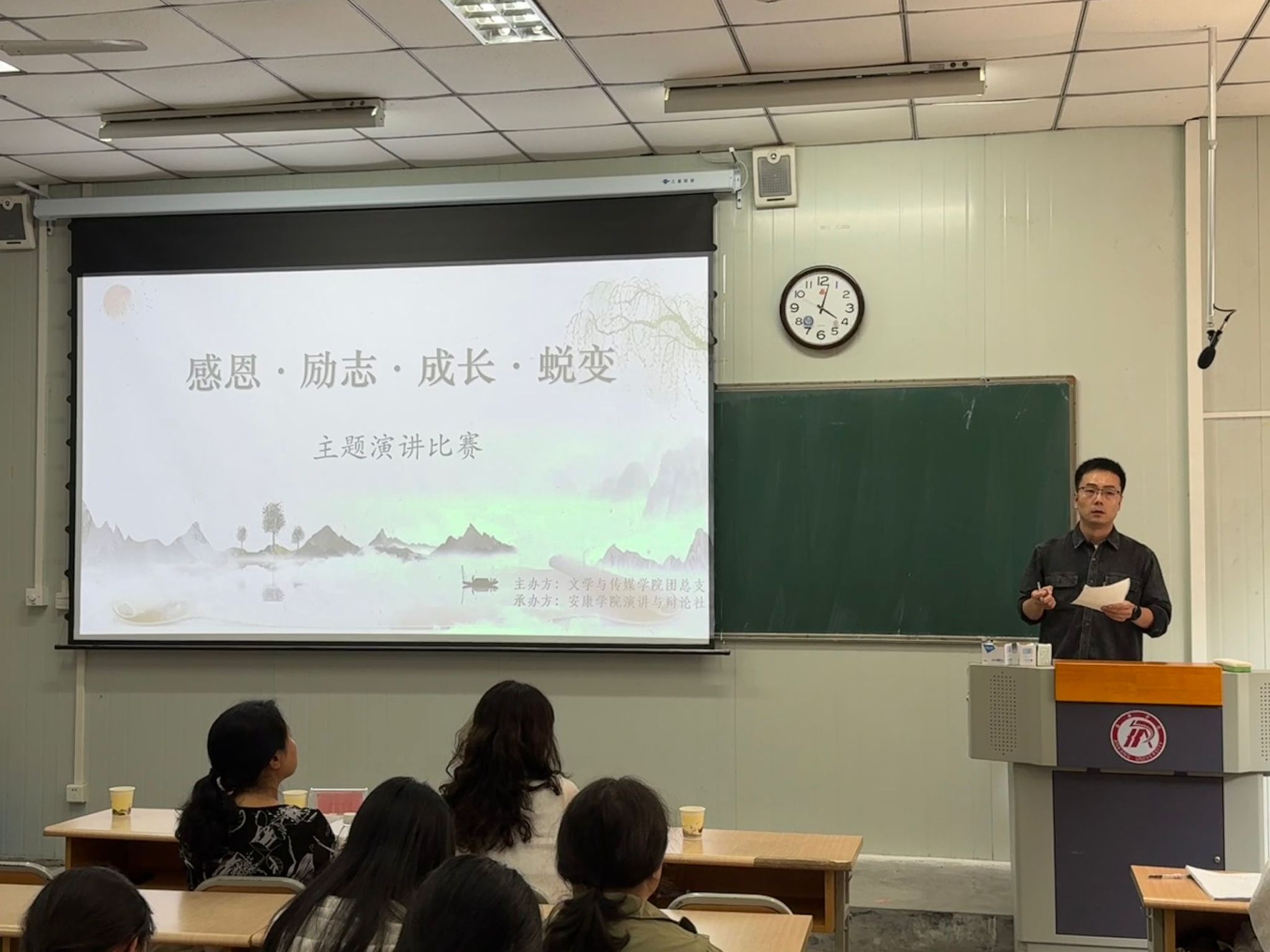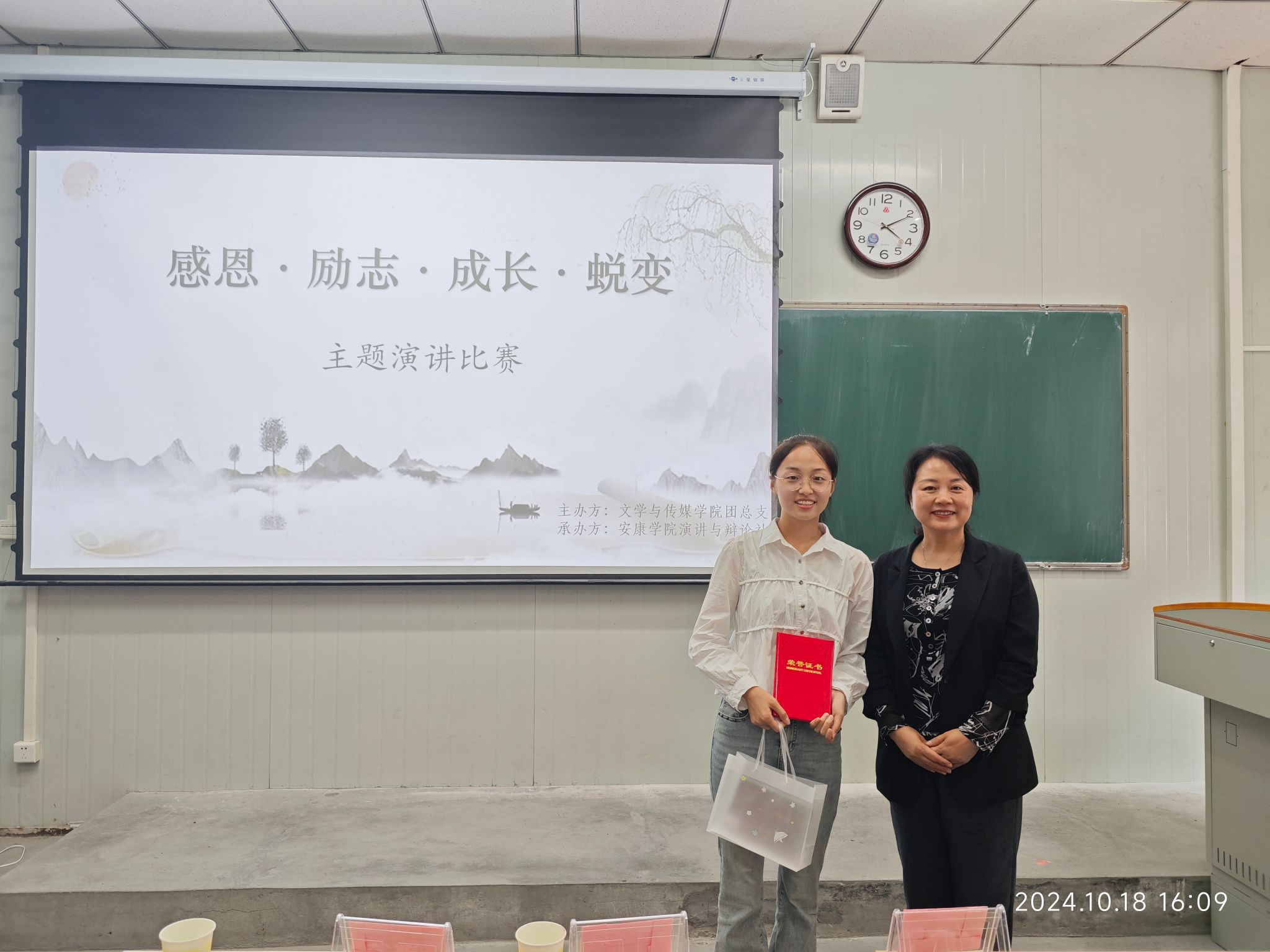 为了充分展示我校大学生的文明素养,引导大学生体悟感恩,培育感恩情怀,做有责任担当的新时代青年,10月18日下午15时,演讲辩论社在江南校区10号楼1017教室举行“感恩·励志·成长·蜕变”主题演讲比赛。文传学院党总支副书记杨海蓉、播音主持社指导老师黄治强、演讲辩论社指导老师余珊担任评委。演讲辩论社王淼同学主持比赛。
