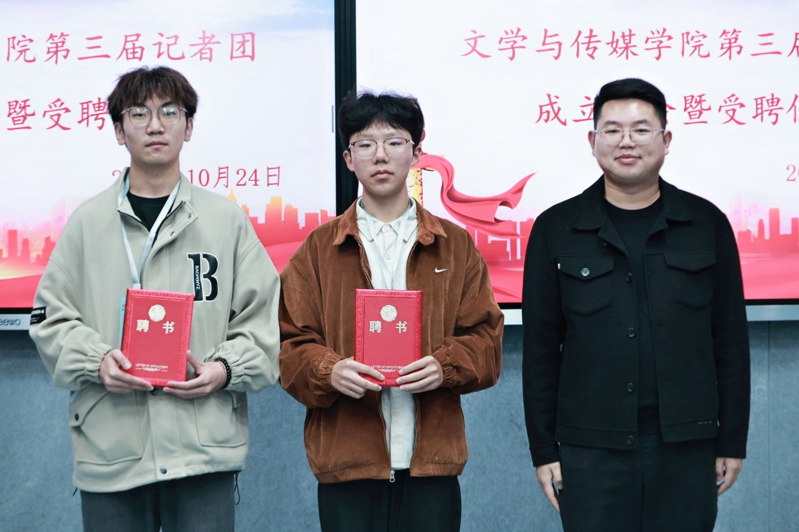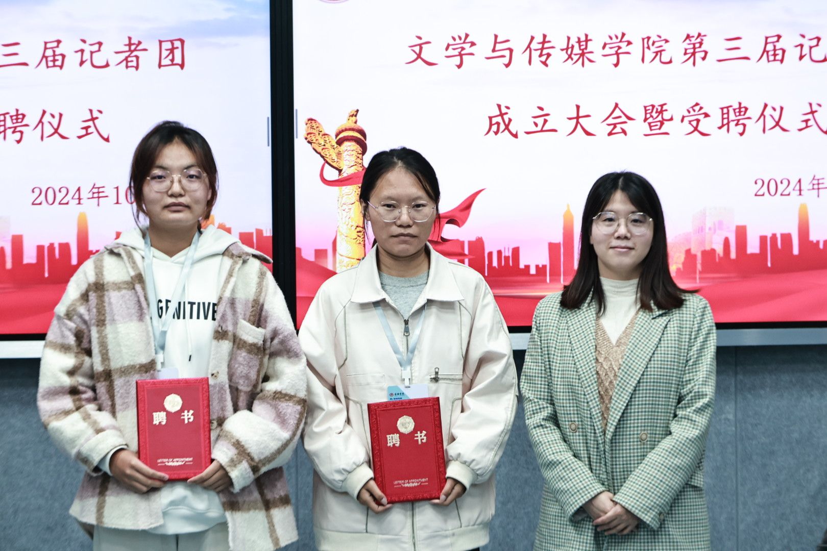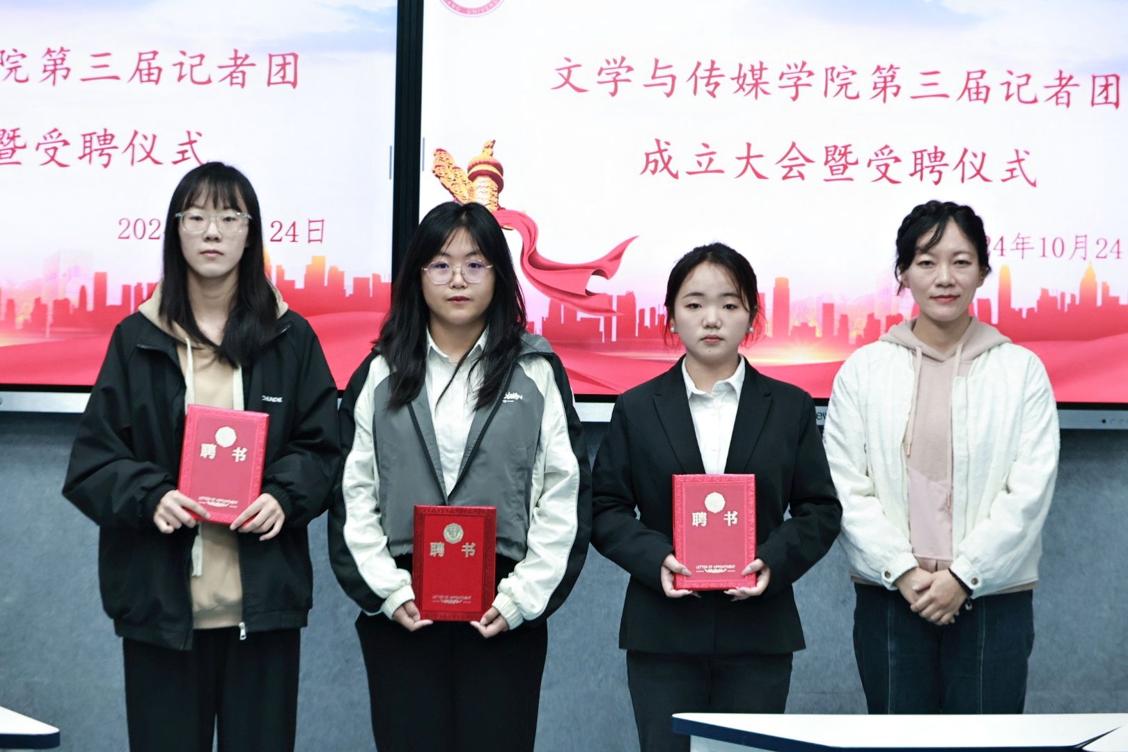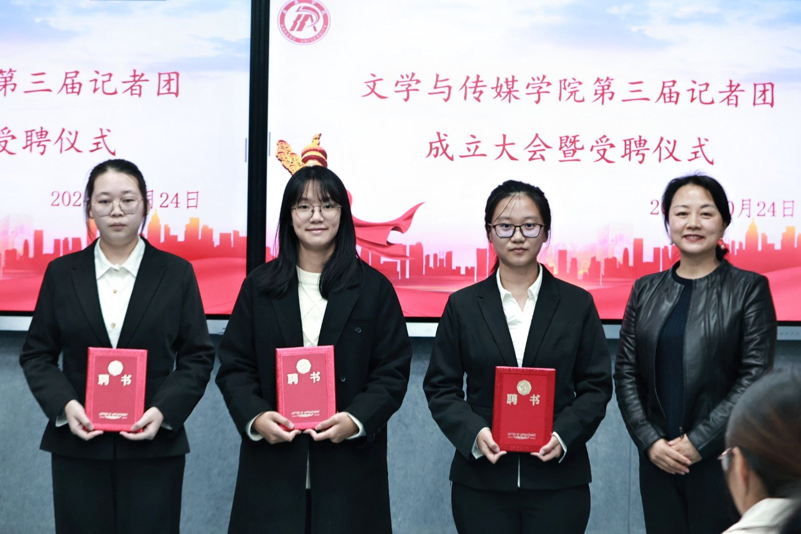 崔瑜宣布第三届记者团成员名单并对记者团新成员的加入表示热烈欢迎。与会老师为主编、副主编、各部门部长颁发聘书。