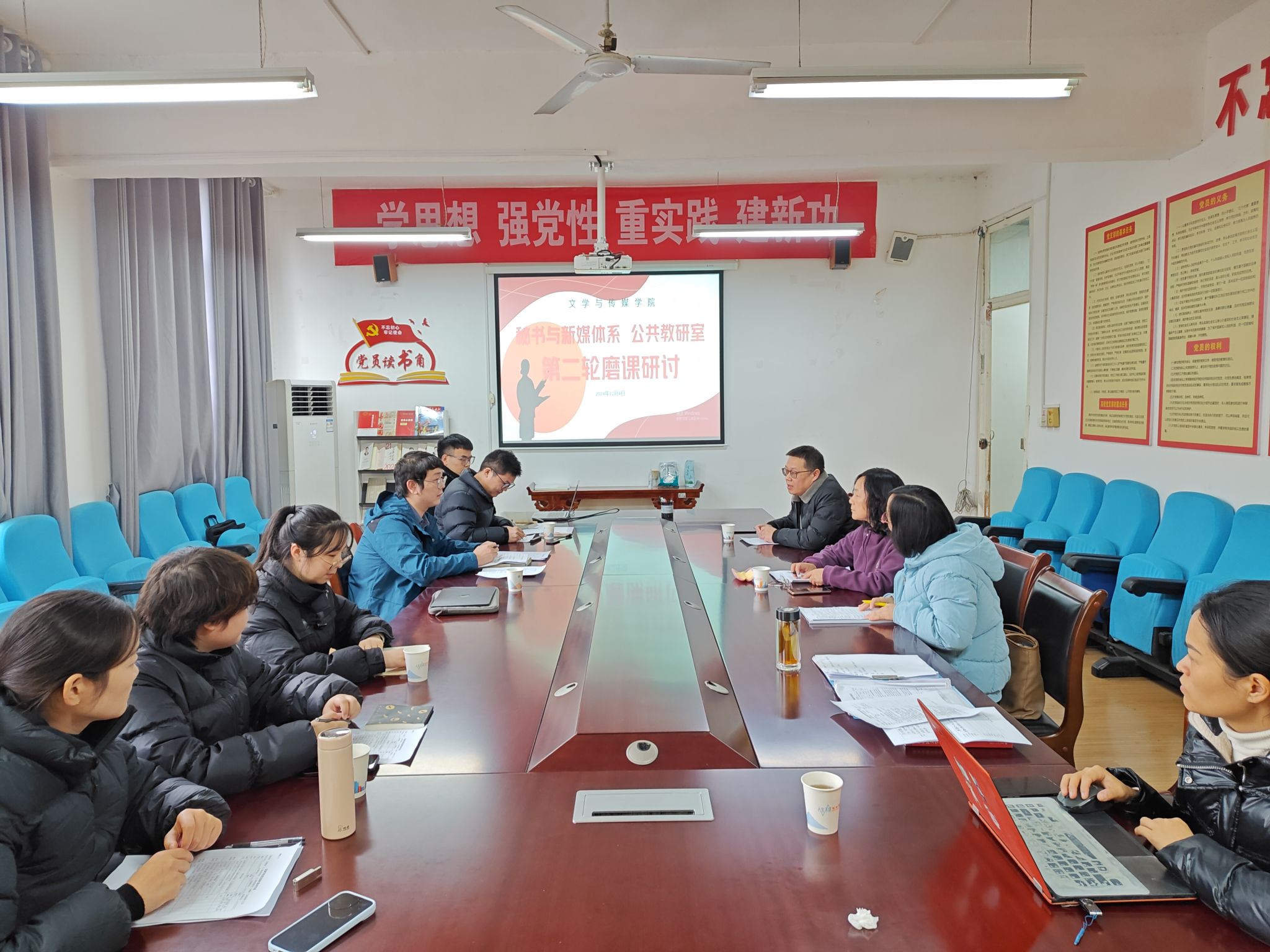 为进一步提高教师课堂教学水平,落实学校教育教学审核评估工作要求,文传学院秘书与新媒体系、公共教研室在12月4日下午联合举办了第二轮磨课研讨活动。活动在2307会议室举行,邀请教学副院长朱云,学院教学督导赵桃、崔瑜现场评点指导,秘书与新媒体系、公共教研室全体教师参与了本轮磨课研讨活动。