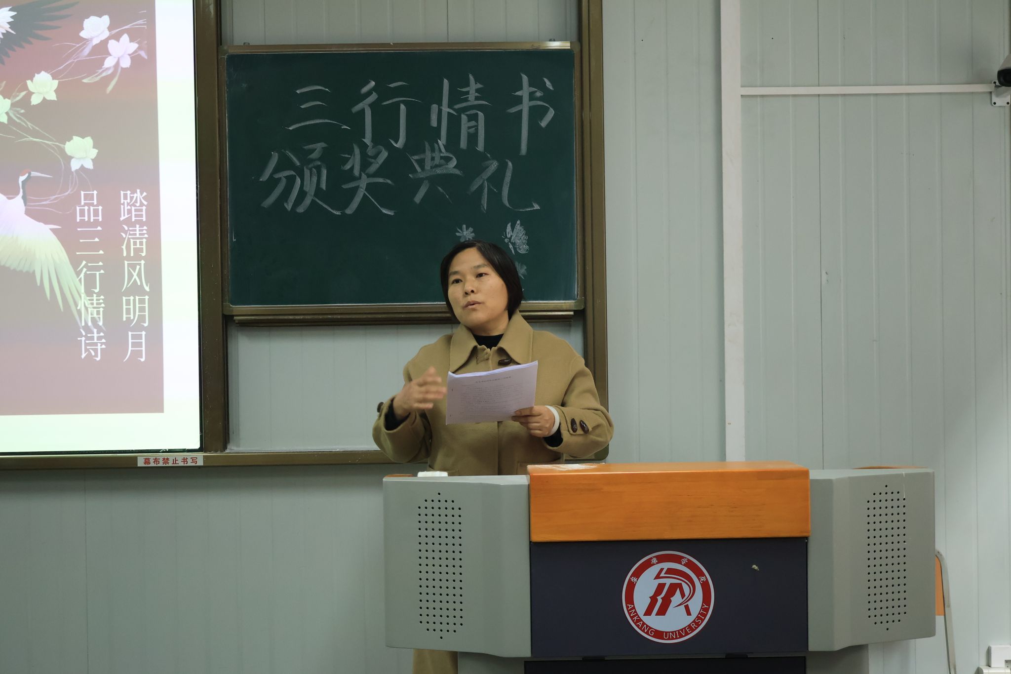 社团指导老师韩文霞为获奖同学颁发证书和奖品并做活动总结讲话。韩老师结合当下社会热点与校园实际情况,阐述了此次大赛的意义,引导学生们树立正确的价值观,明了文学创作的魅力所在,勉励学生们继续努力,在文学创作之路上行稳致远。