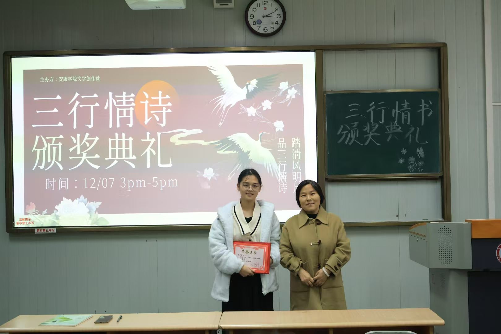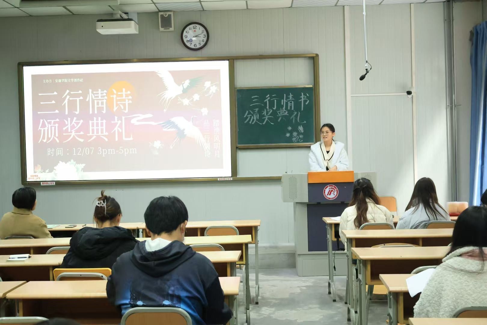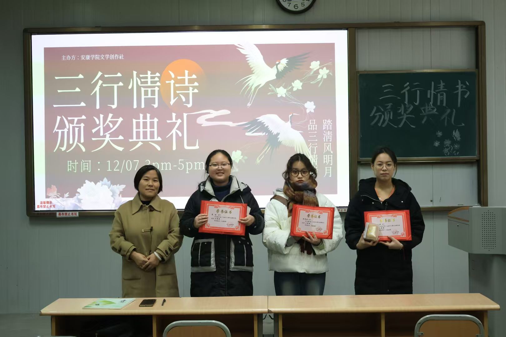 为了激发学生的创作热情,提升学生的文学素养,近期文学创作社举办了“三行情诗”大赛。经过评选,于12月7日下午在江南校区1013教室举行颁奖典礼,社团指导老师韩文霞及社团全体成员和获奖人员参与活动。