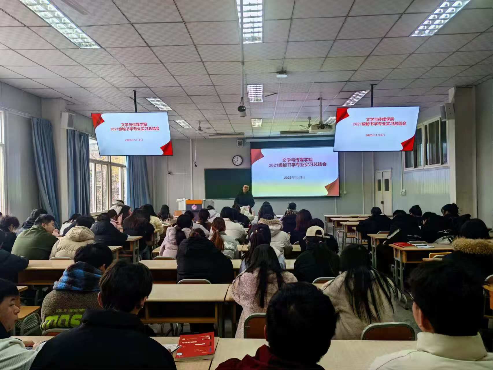 2025年1月5日,日本少妇AA一级特黄大片在1026教室召开秘书学专业实习总结会,副院长朱云、实习带队教师胡少山以及2021级、2022级秘书学专业学生参会,会议由实习生李欣窈主持。