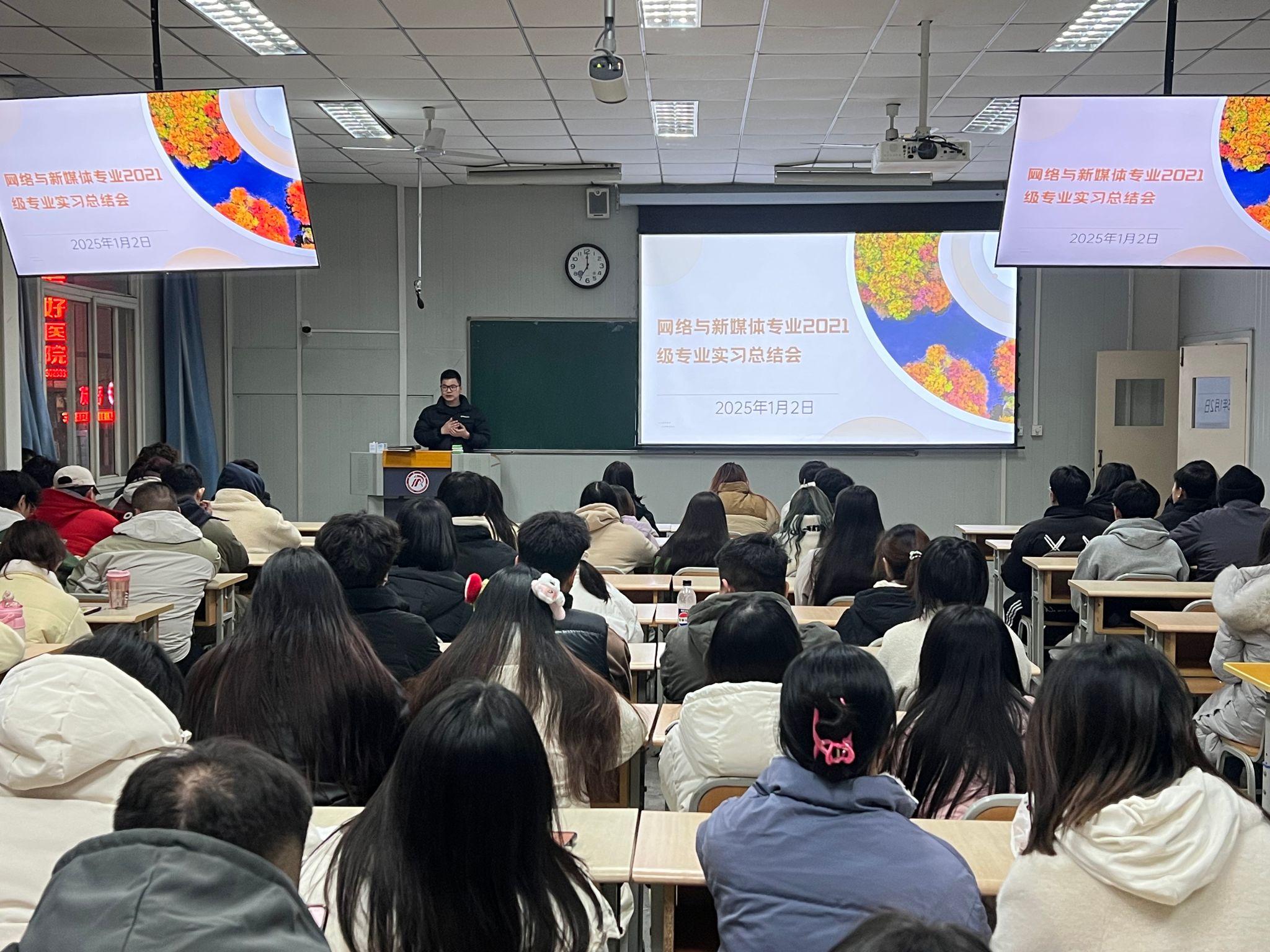 2025年1月2日,秘书与新媒体系在1022教室成功举办了网络与新媒体专业实习总结会。网络与新媒体专业2021级与2022级的101名学生参会了总结会,由系主任张建涛主持。