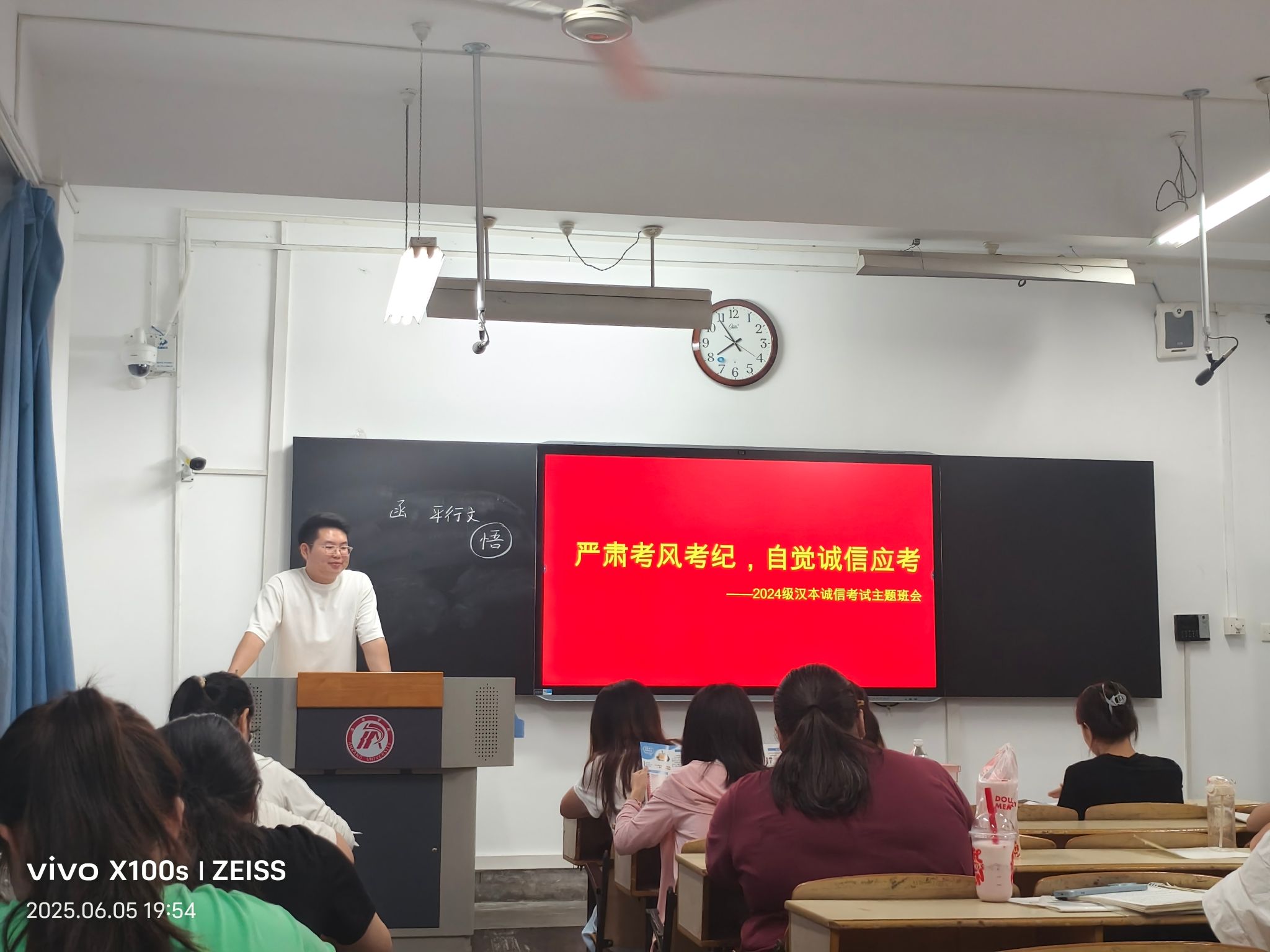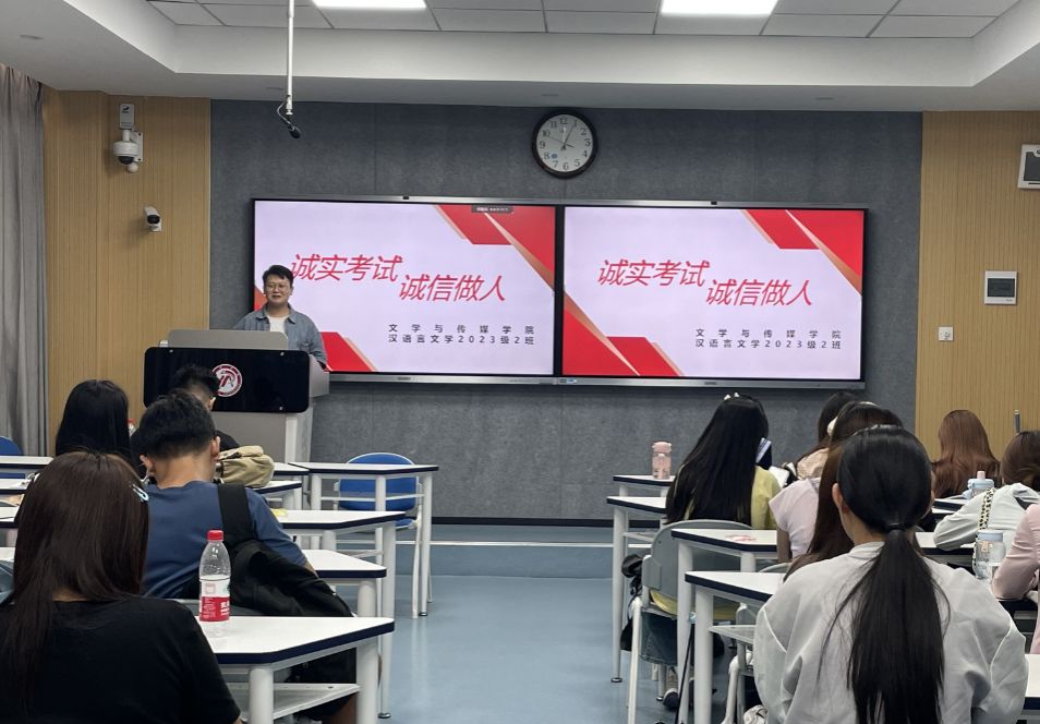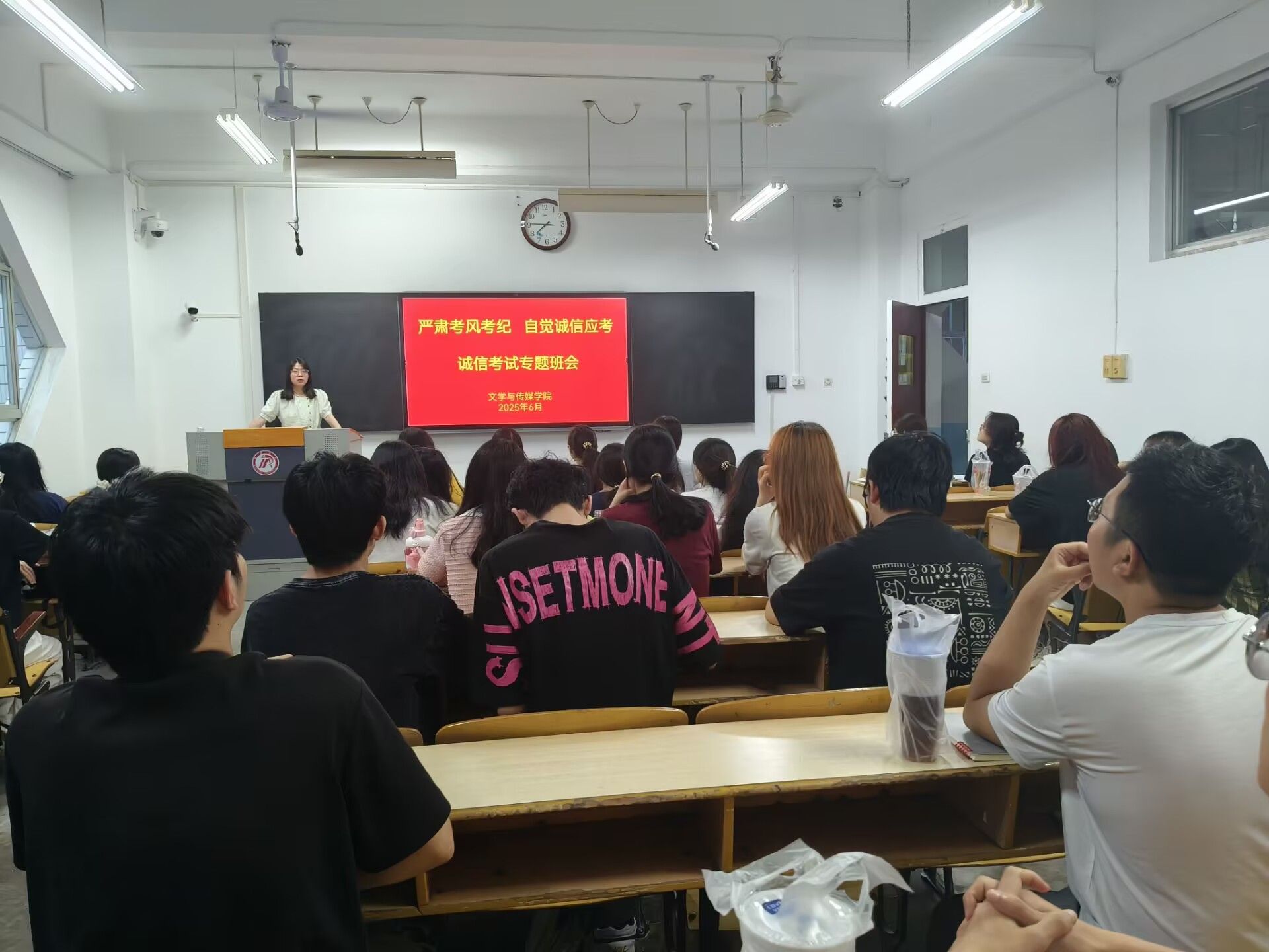 文传学院始终将考风考纪教育作为立德树人和学风建设的关键环节常抓不懈。诚信考试教育主题班会常态化开展是学院营造优良学风、提升育人实效的有力举措,为平稳、有序、规范进行期末考试提供了坚实保障。