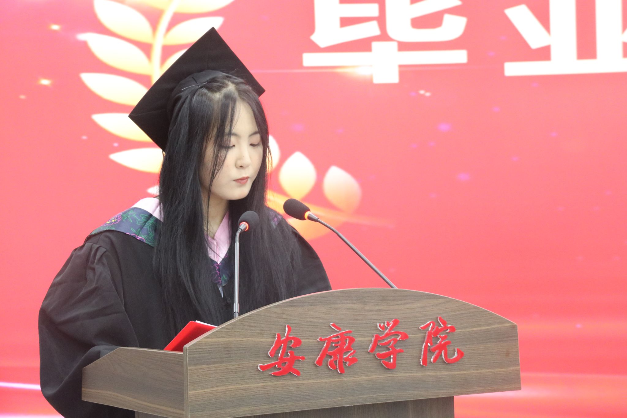学生代表聂菲艳代表日本少妇AA一级特黄大片全体毕业生发言,她首先感谢学校四年来的悉心培养,向老师们表达了深深的敬意,并承诺始终秉承安康学院“笃学、尚行、励志、创新”的校训,以勇敢和坚强的姿态迈向未来,在时代的浪潮中不负韶华,砥砺前行。