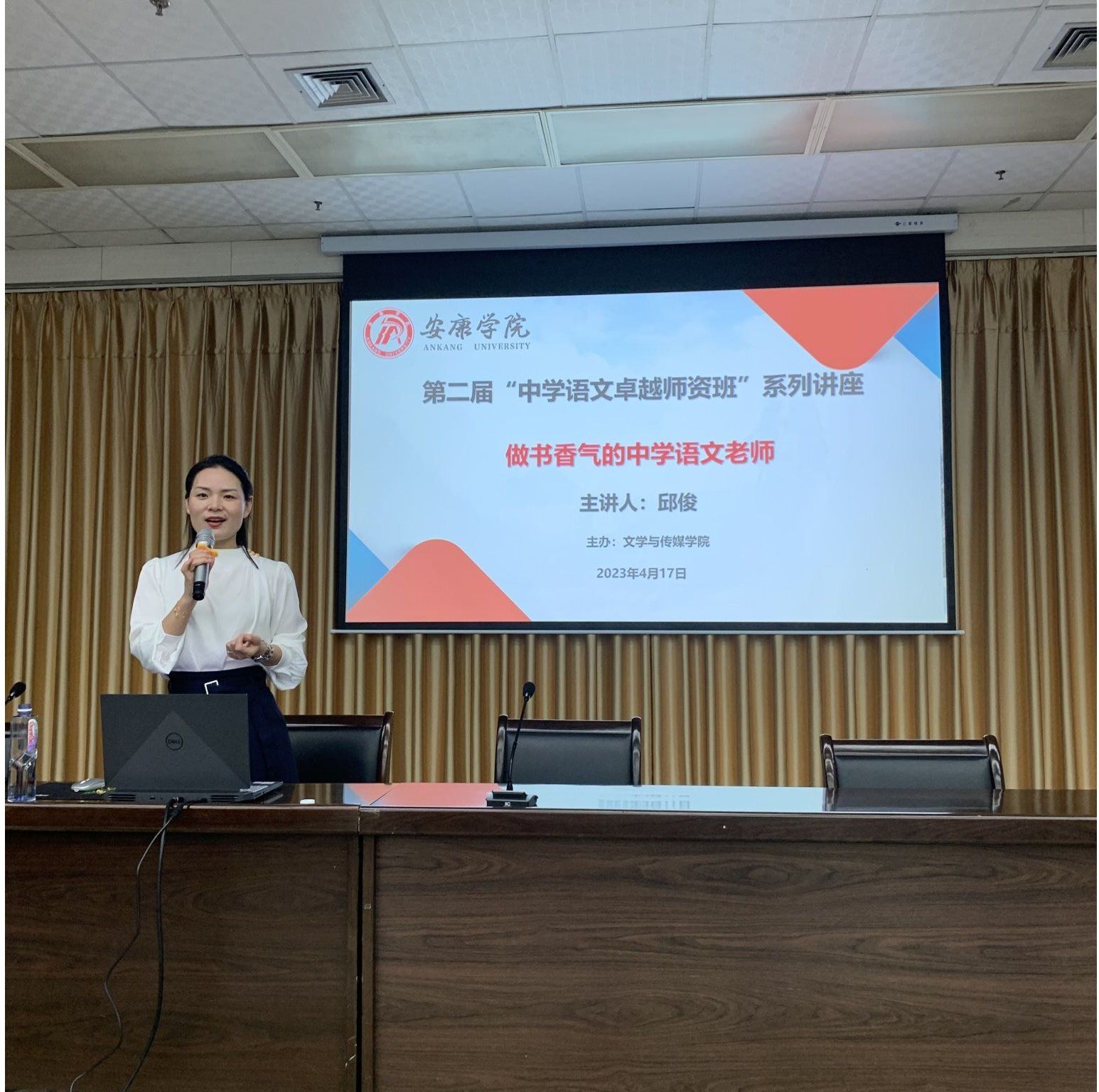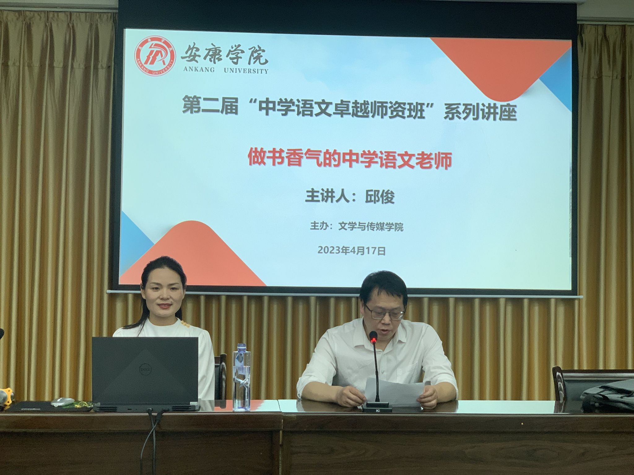 2023年4月17日下午七点半,陕西省教学名师、安康市教研室专家邱俊老师应邀为我院第二届“中学语文卓越师资班”系列讲座做了题为“做书香气的中学语文老师”的首场讲座。讲座由文传学院副院长朱云主持,班主任张格瑄和“中学语文卓越师资班”的135名同学聆听了本场讲座。