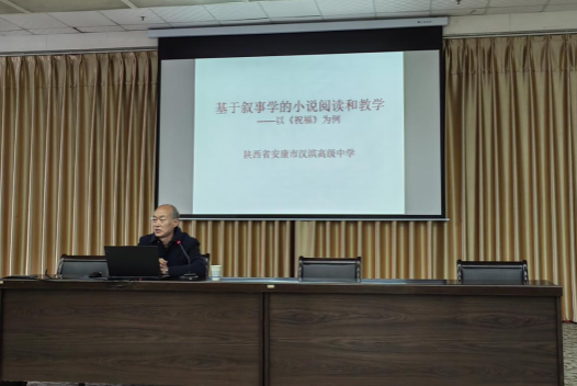 2023年11月15日下午2点半,文传学院邀请汉滨高级中学、省级学科带头人和教学能手程时进老师为我院第三届“中学语文卓越师资班”师生做了题为《基于叙事学的小说阅读和教学——以<祝福>为例》的精彩讲座。讲座由卓越师资班班主任唐明珍主持,“中学语文卓越师资班”全体学生聆听了本场讲座。