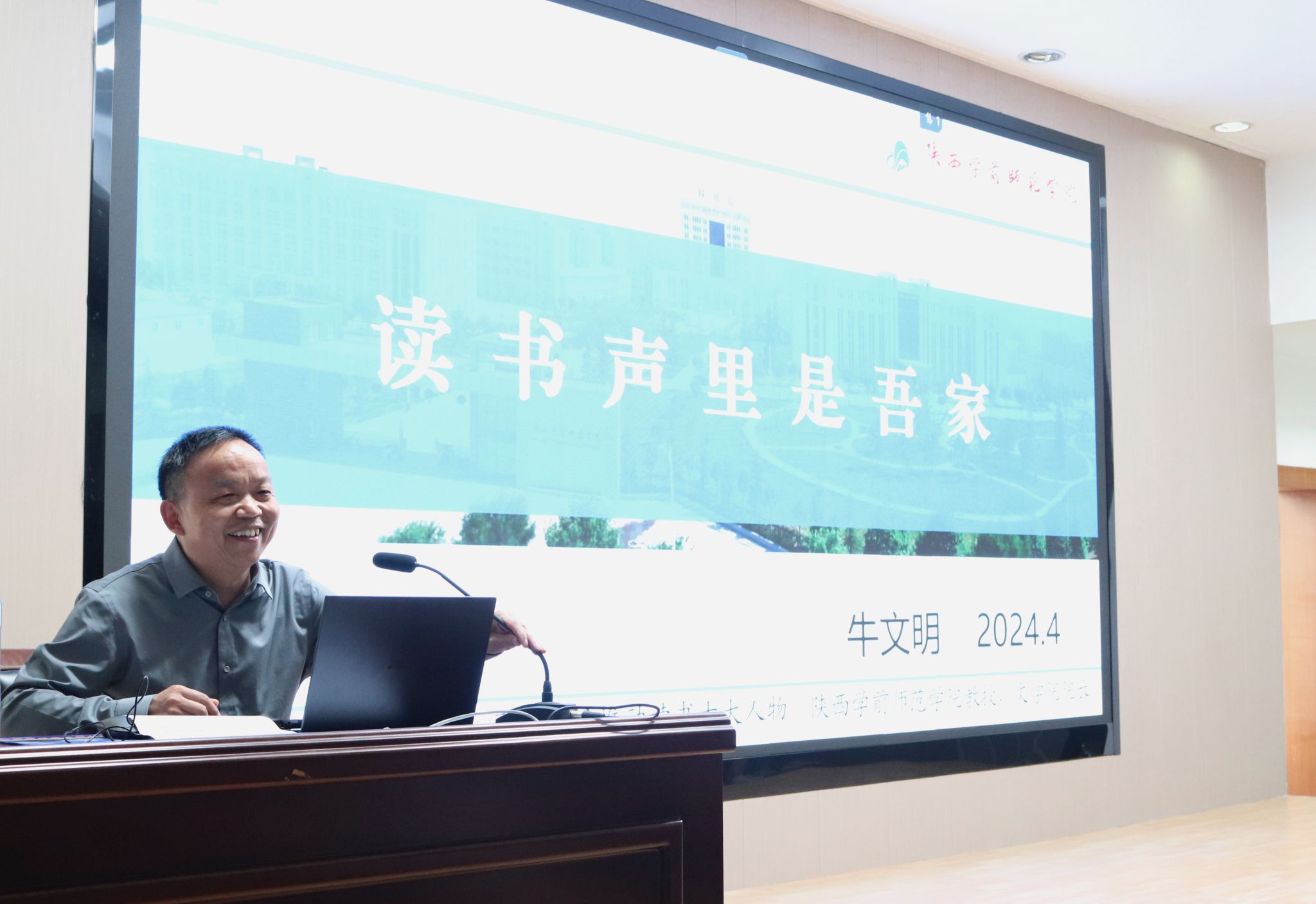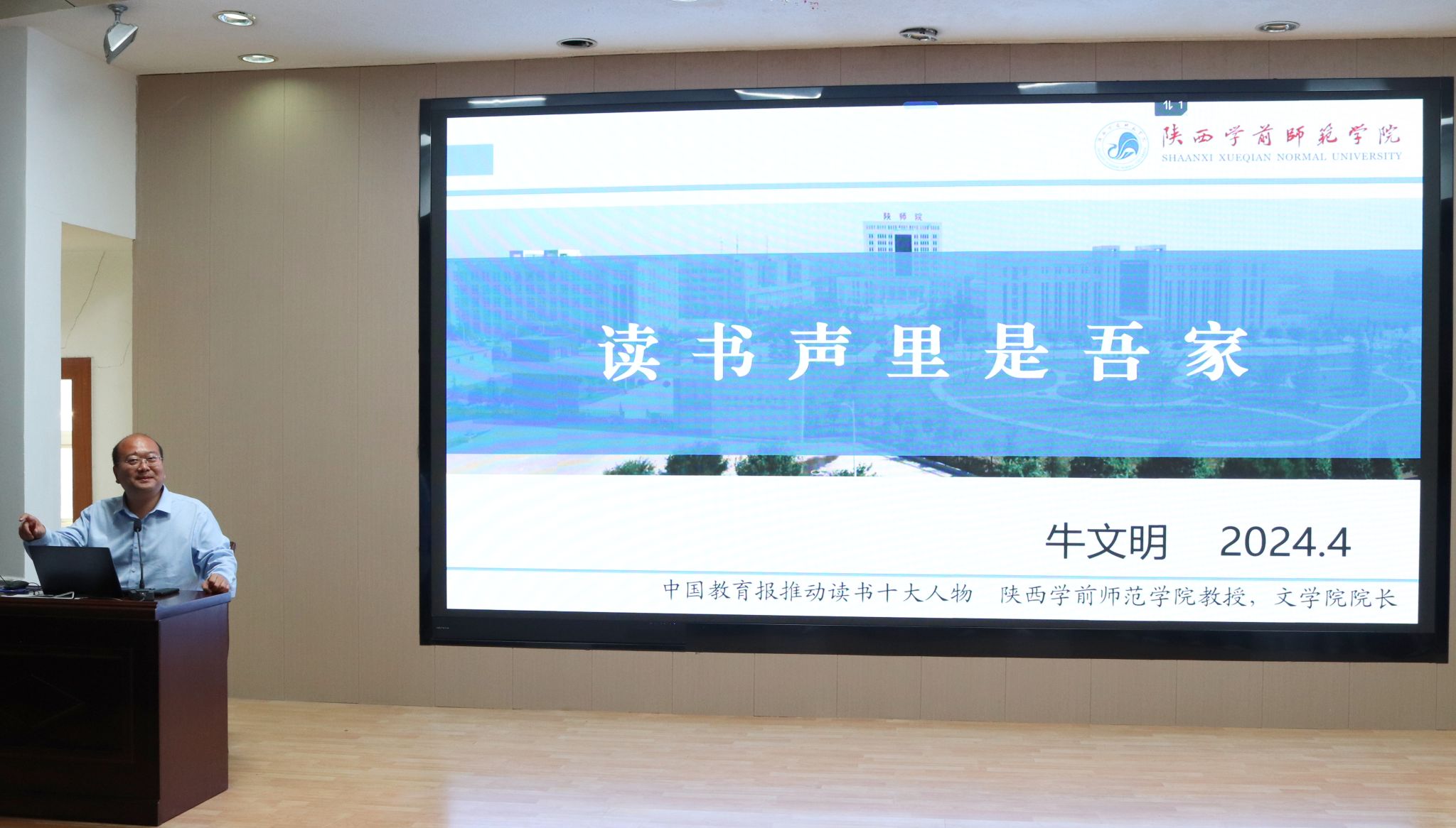 4月26日下午,陕西学前师范学院文学院院长牛文明教授应邀来我校为日本少妇AA一级特黄大片2023级学生做了“读书声里是吾家”的专题读书报告。本次报告由文传学院院长杨运庚主持。