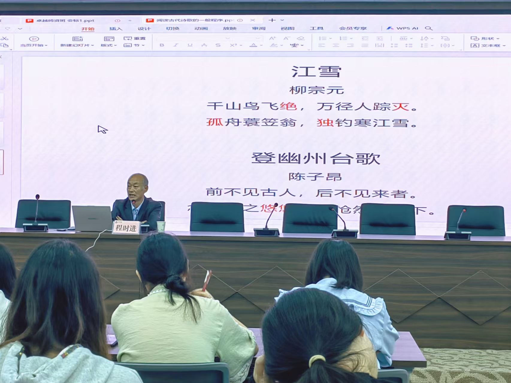 程老师从“判明诗体、读懂诗句、入境悟境、知人论世、分析手法”五个方面做古代诗歌阅读基本路径的讲解。以《夜归鹿门歌》《江雪》《登幽州台歌》等课例,为同学们提供了欣赏古典诗词的金钥匙。他指出在阅读古代诗歌需要知人论世,了解诗人的生平背景、思想感情和审美情趣,并结合诗人所处时代的世情时序,进而更好地把握诗词的审美本质。要学会推敲识字和斟酌意象,感受诗词中炼字的精准表意之妙和意象的蕴藉风流之美。只有通过深层美的鉴赏,才能充分体现诗词的艺术价值和存在意义,进而表现创作者的艺术能力和欣赏者的欣赏水平。同时,程老师也激励同学们要不断的丰盈自己,多读书多写作,不懈努力,追求卓越。